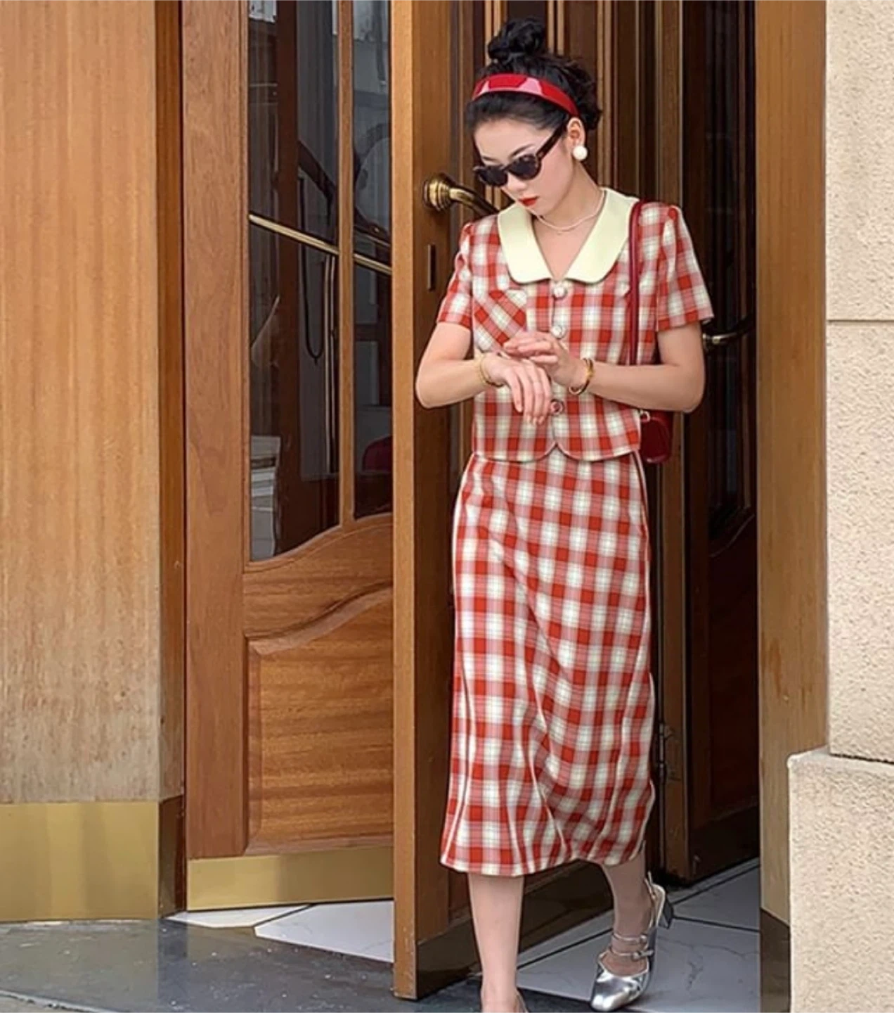 This adorable red and white plaid two-piece set is perfect for a retro-chic look! The imported k-fashion set includes a short-sleeved button-up top and a matching midi skirt. It's in great condition and ready for a new wardrobe