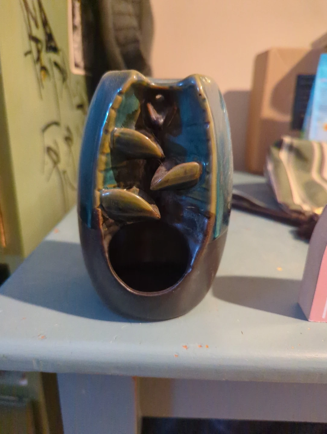 Unique backflow incense burner in excellent condition! It's a beautiful decorative piece that creates a mesmerizing visual effect as the smoke flows downwards. Perfect for adding a touch of tranquility to any room