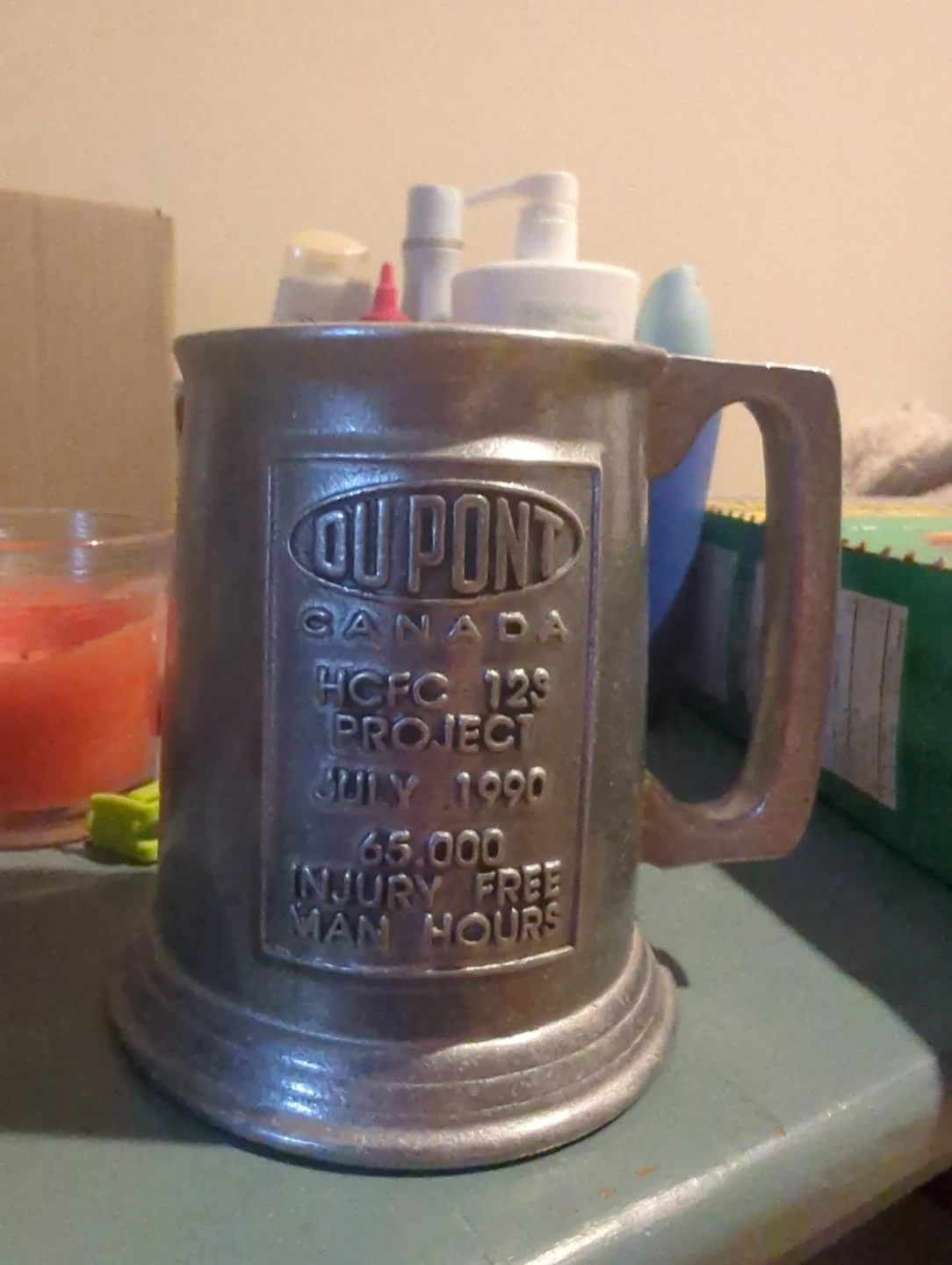 I'm selling a vintage DUPONT Canada mug from the HCFC 123 Project. It's a unique piece with the inscription 'JULY 1990' and '65,000 INJURY FREE MAN HOURS'. A great collectible item!