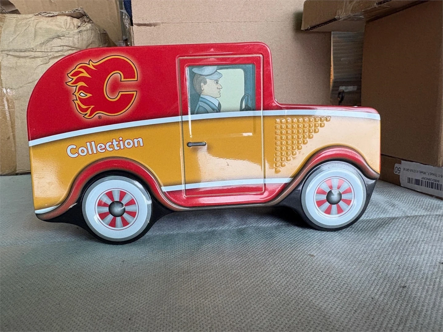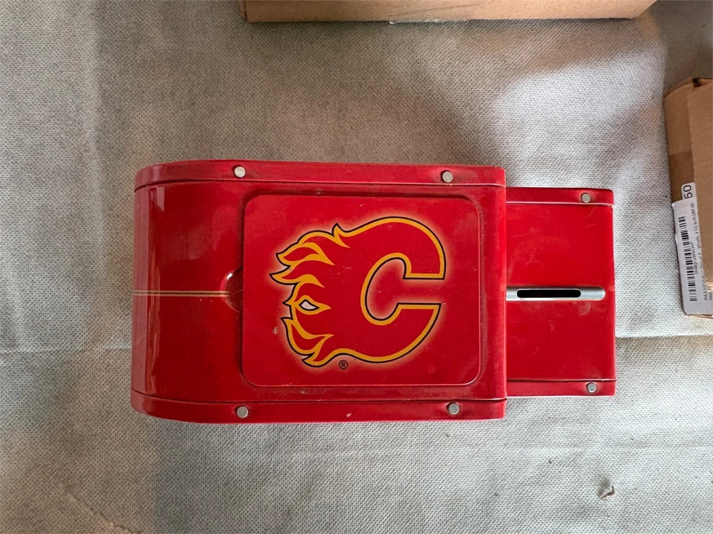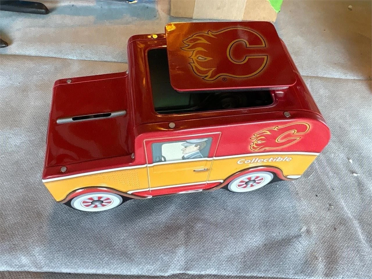 Selling a Calgary Flames collectible coin bank shaped like a vintage truck! It's in great shape and perfect for any Flames fan looking to add a unique piece to their collection. The bank features the iconic Flames logo and colours. A fun way to save your coins!
