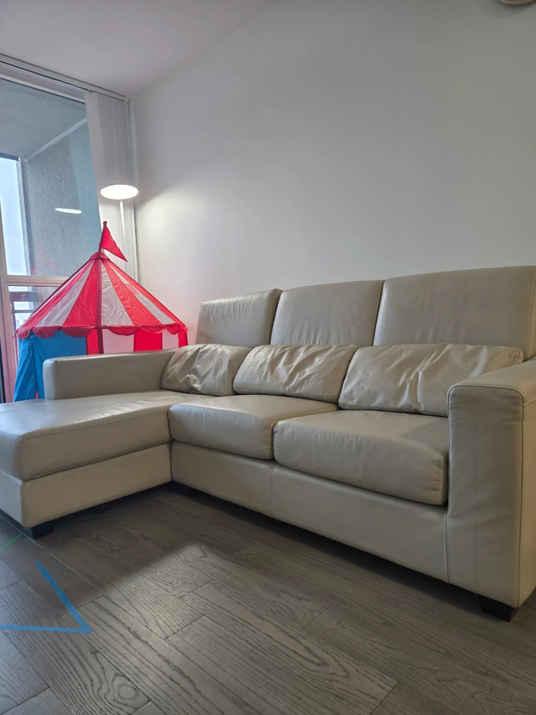 Selling a comfortable beige leather sectional sofa. It's in great condition and ready for a new home! Perfect for a living room or den.