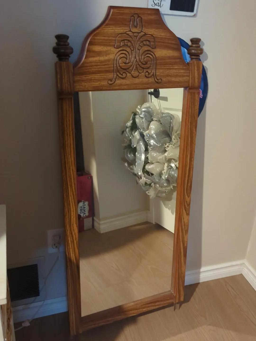 Here's a lovely wooden framed mirror! It has a beautiful carved design at the top. Perfect for adding a touch of warmth to any room