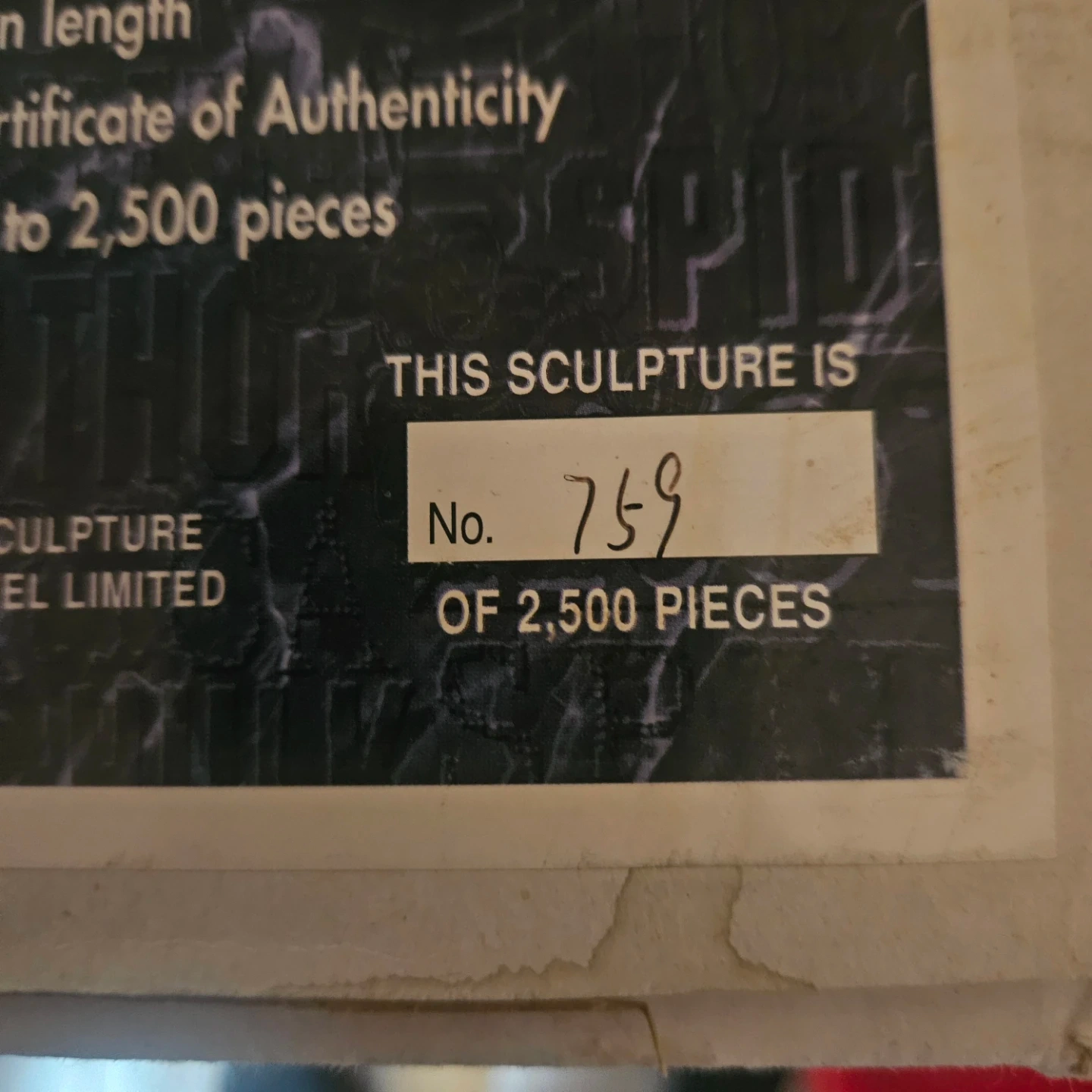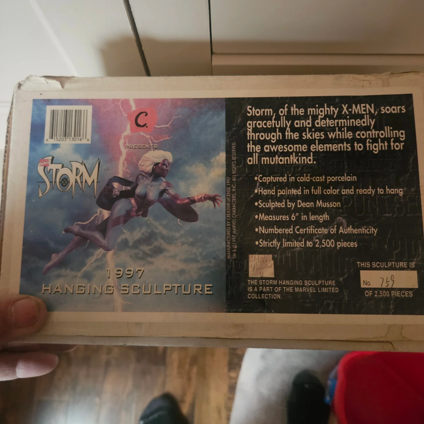 Selling a Marvel limited edition hanging sculpture of Storm from the X-Men, made in 1997. This is number 759 of 2,500 pieces. It's a cold-cast porcelain sculpture, hand-painted in full colour, and measures 6" in length. It comes with a numbered Certificate of Authenticity and is part of the Marvel Limited Collection