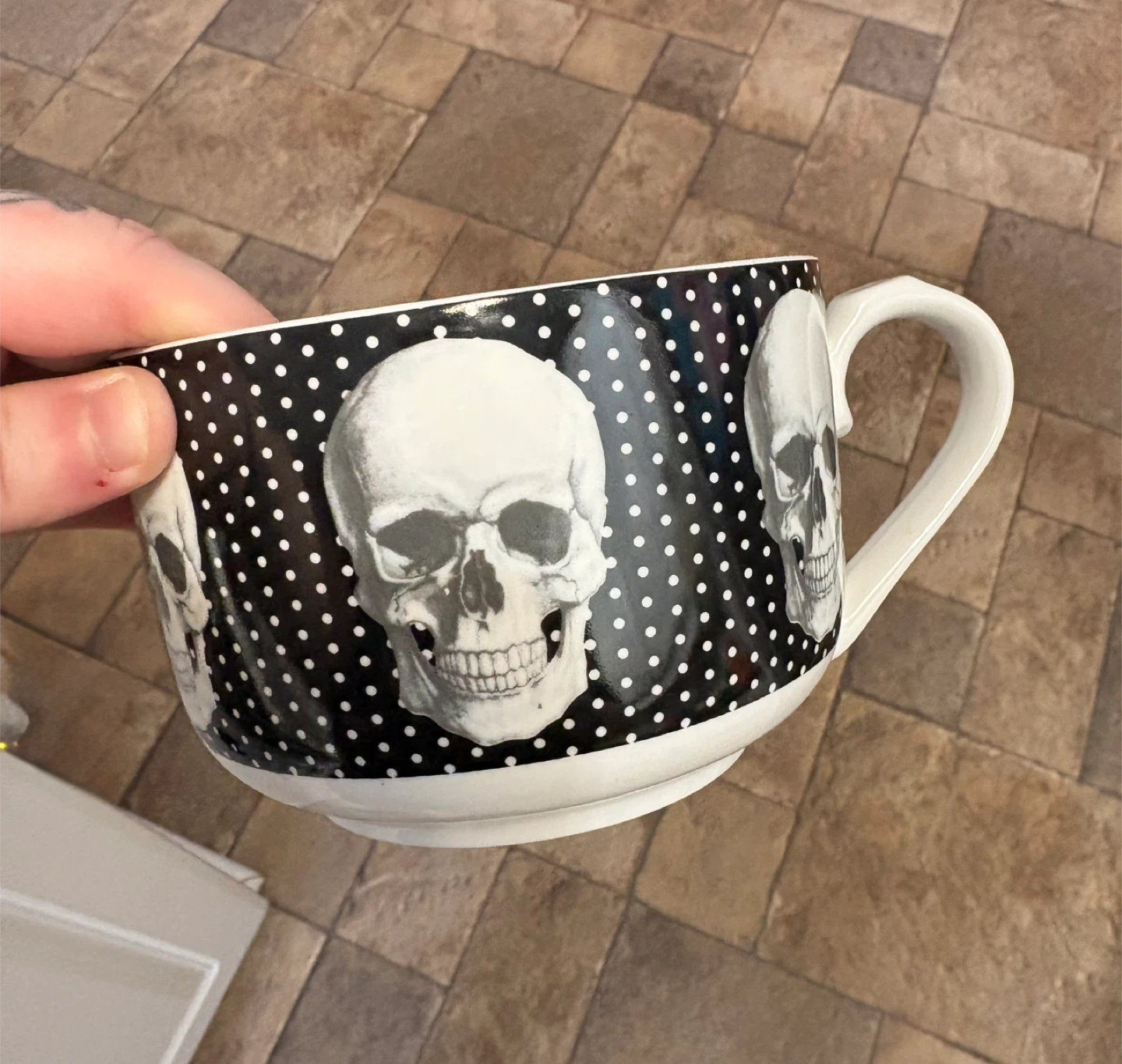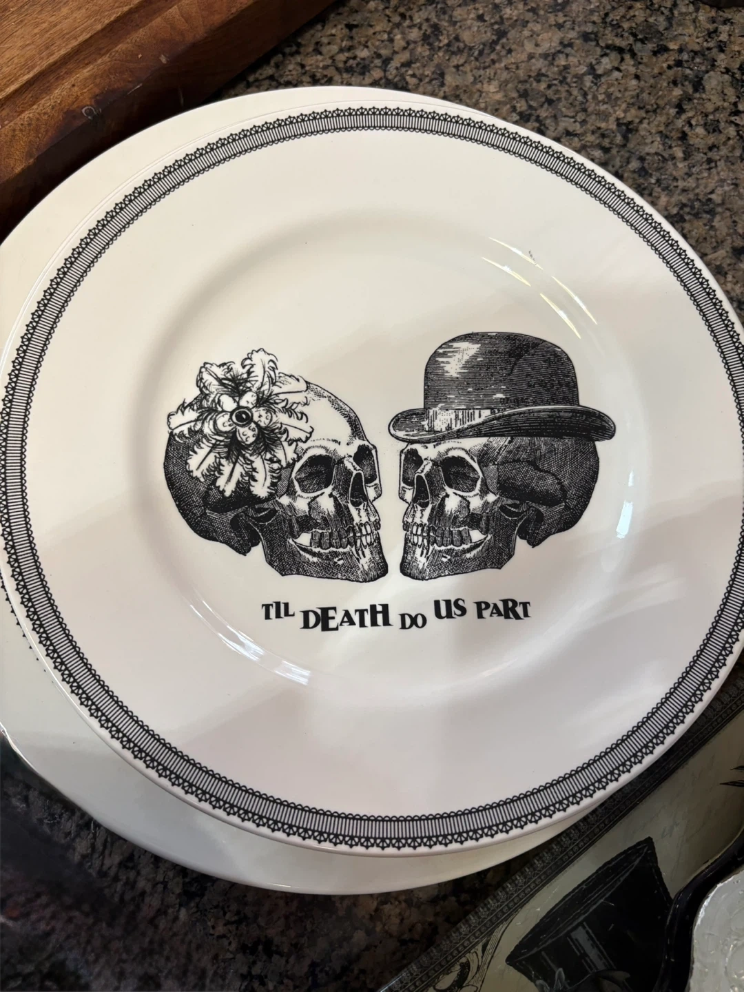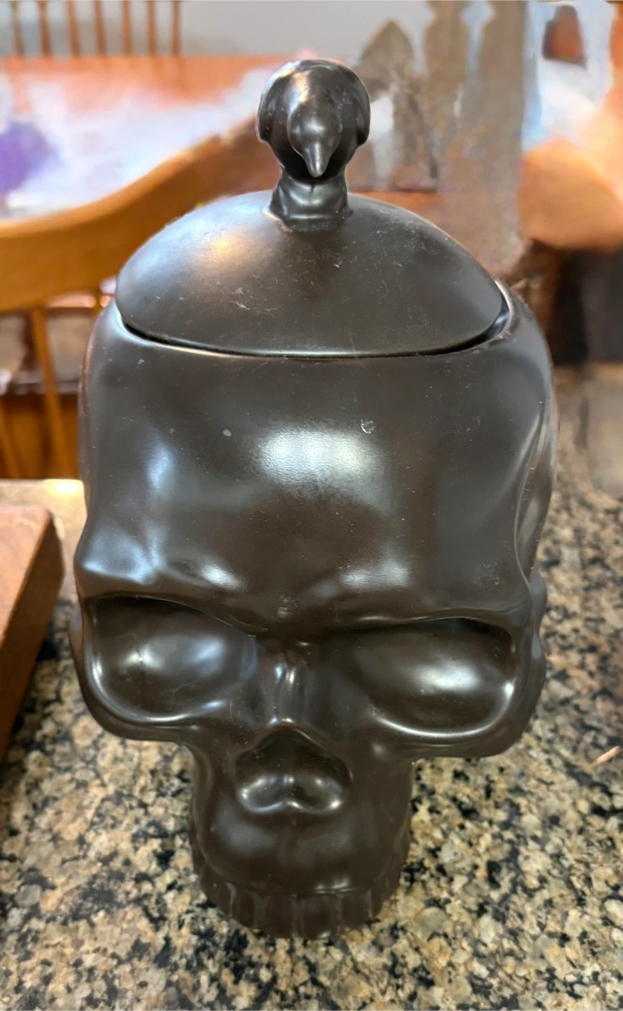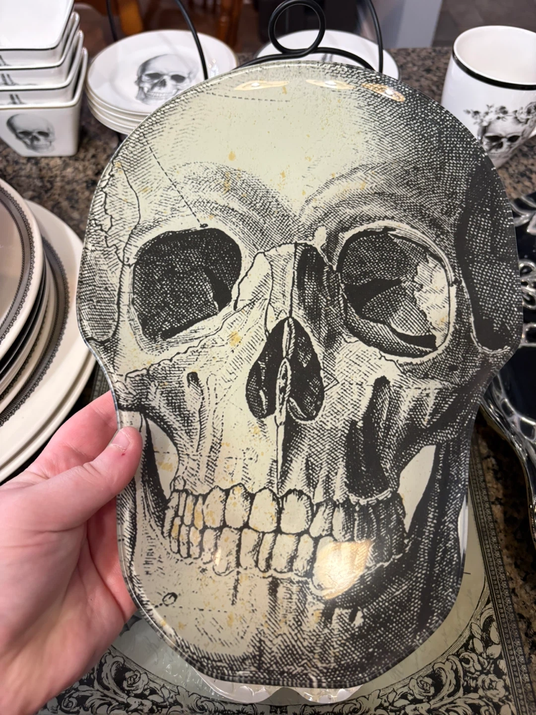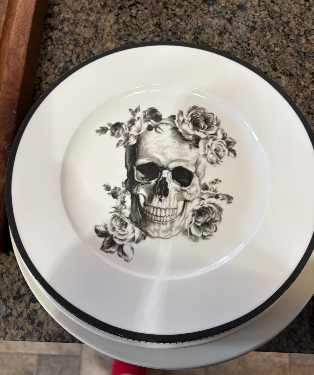 Selling a set of skull themed dishware. Includes plates, bowls, mugs, and a decorative skull jar. Perfect for Halloween or any skull lover!