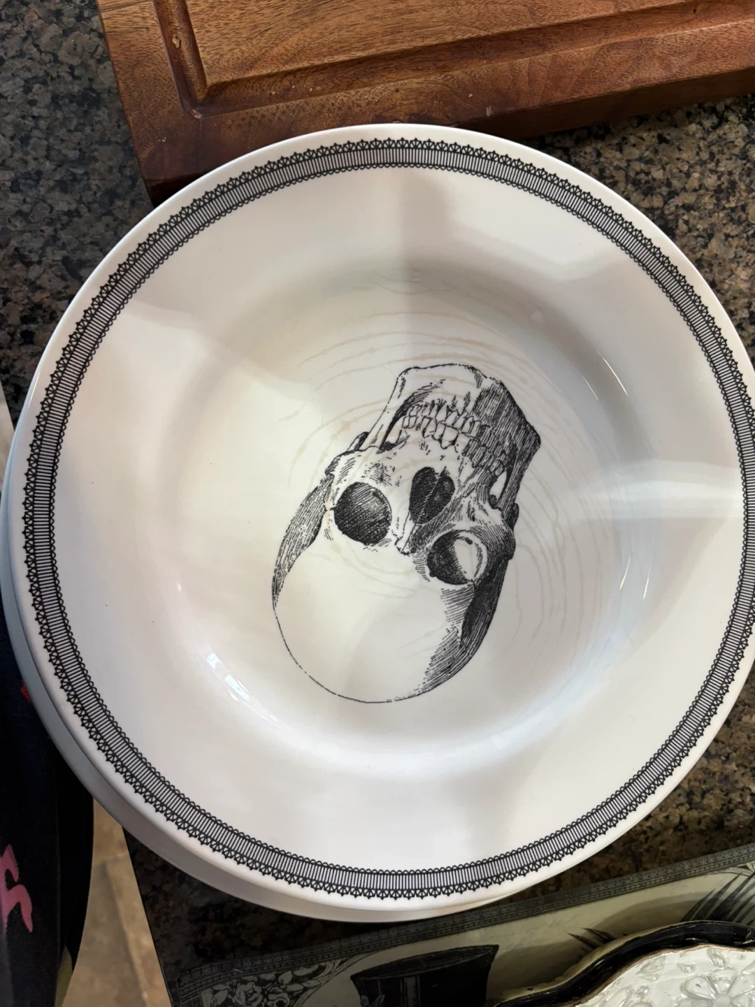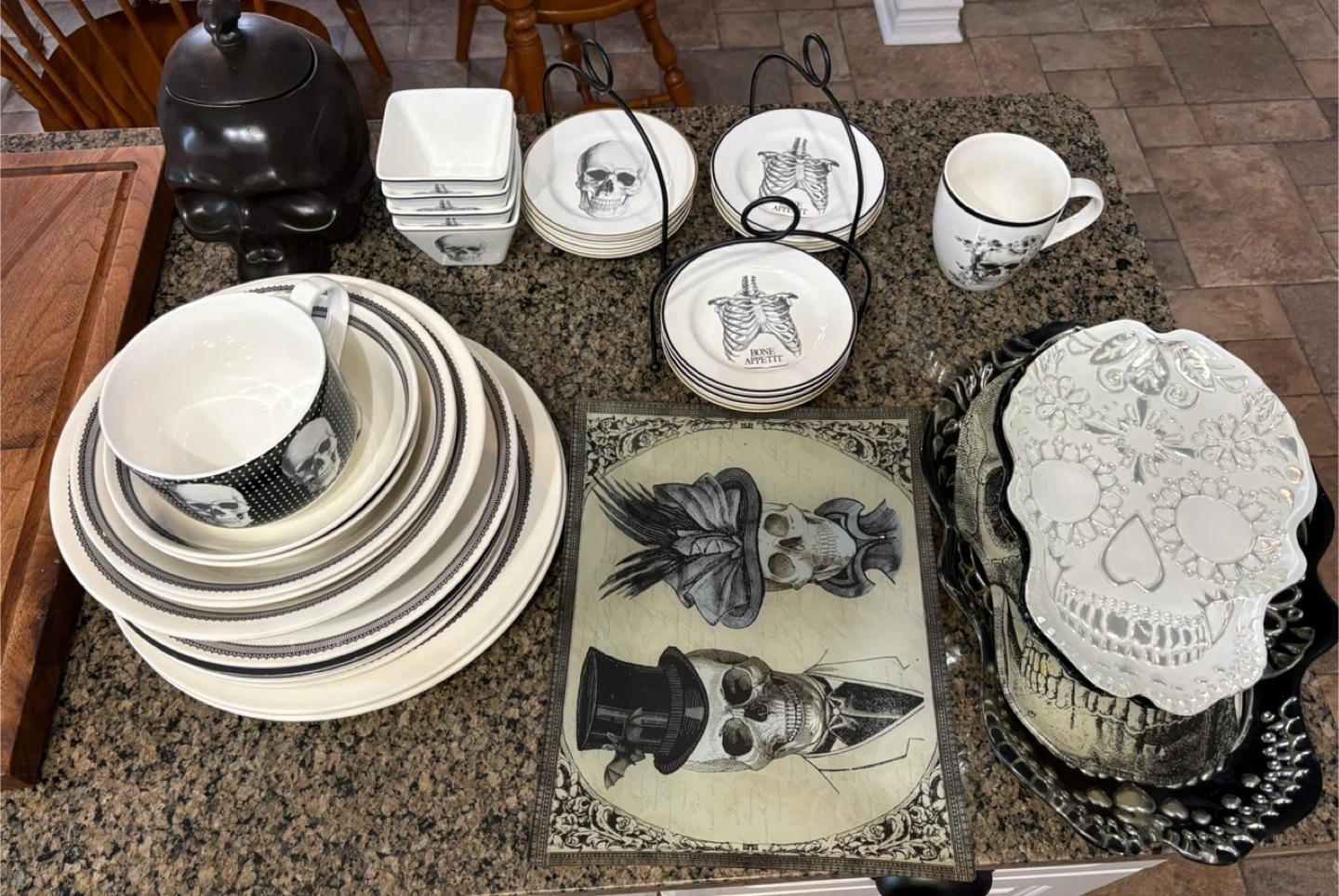 Selling a set of skull themed dishware. Includes plates, bowls, mugs, and a decorative skull jar. Perfect for Halloween or any skull lover!