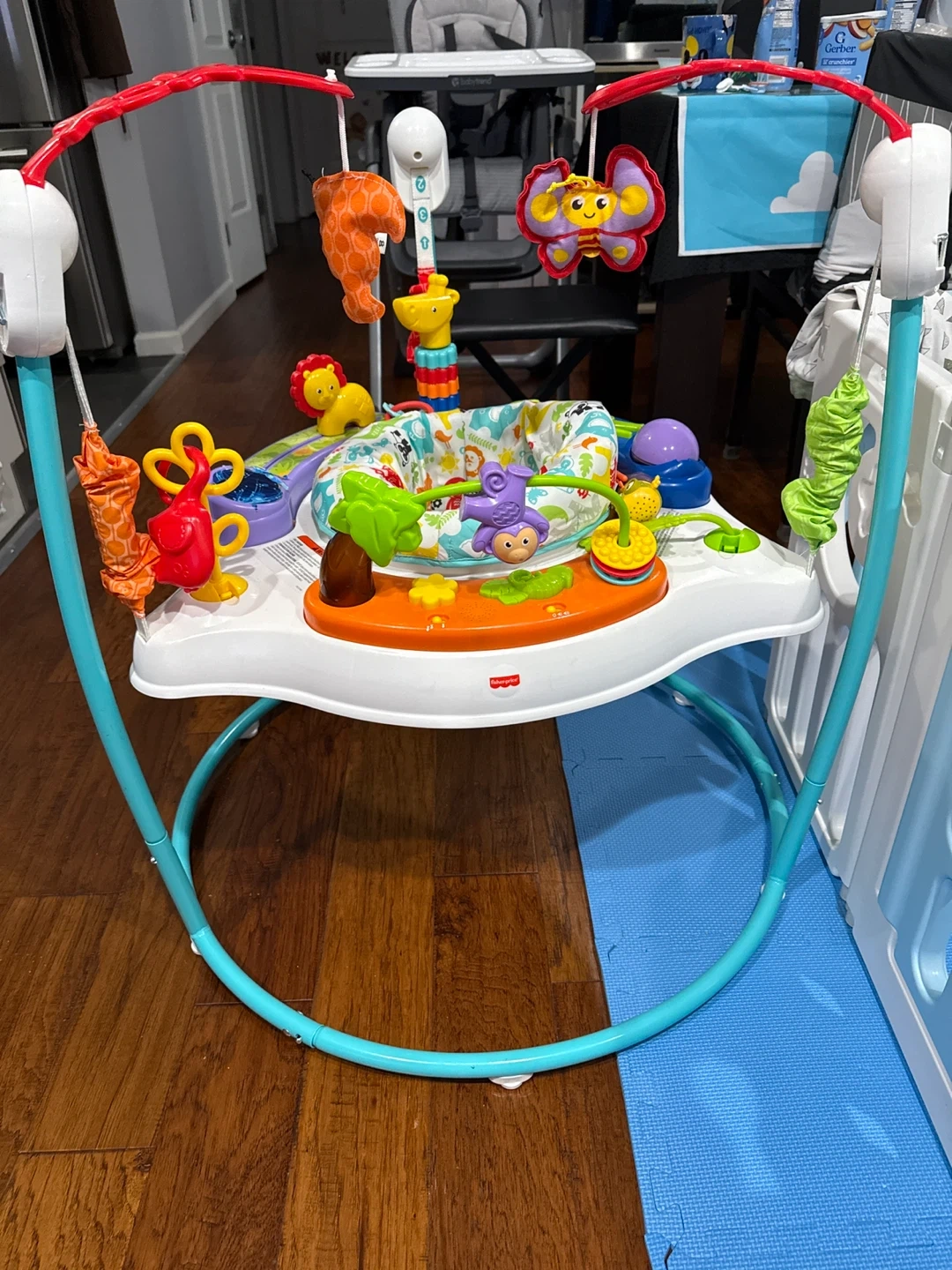 Selling a Fisher-Price Jumperoo! It's in great condition and ready for a new little one. This bouncer is perfect for keeping your baby entertained and active with its fun lights, sounds, and toys. It's designed to help develop motor skills and coordination, all while keeping your baby safe and secure