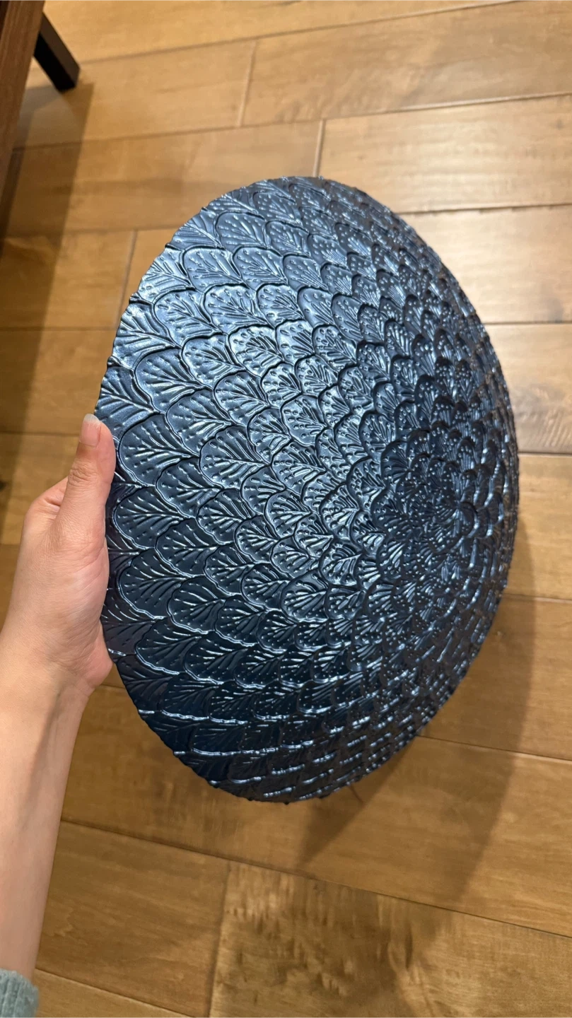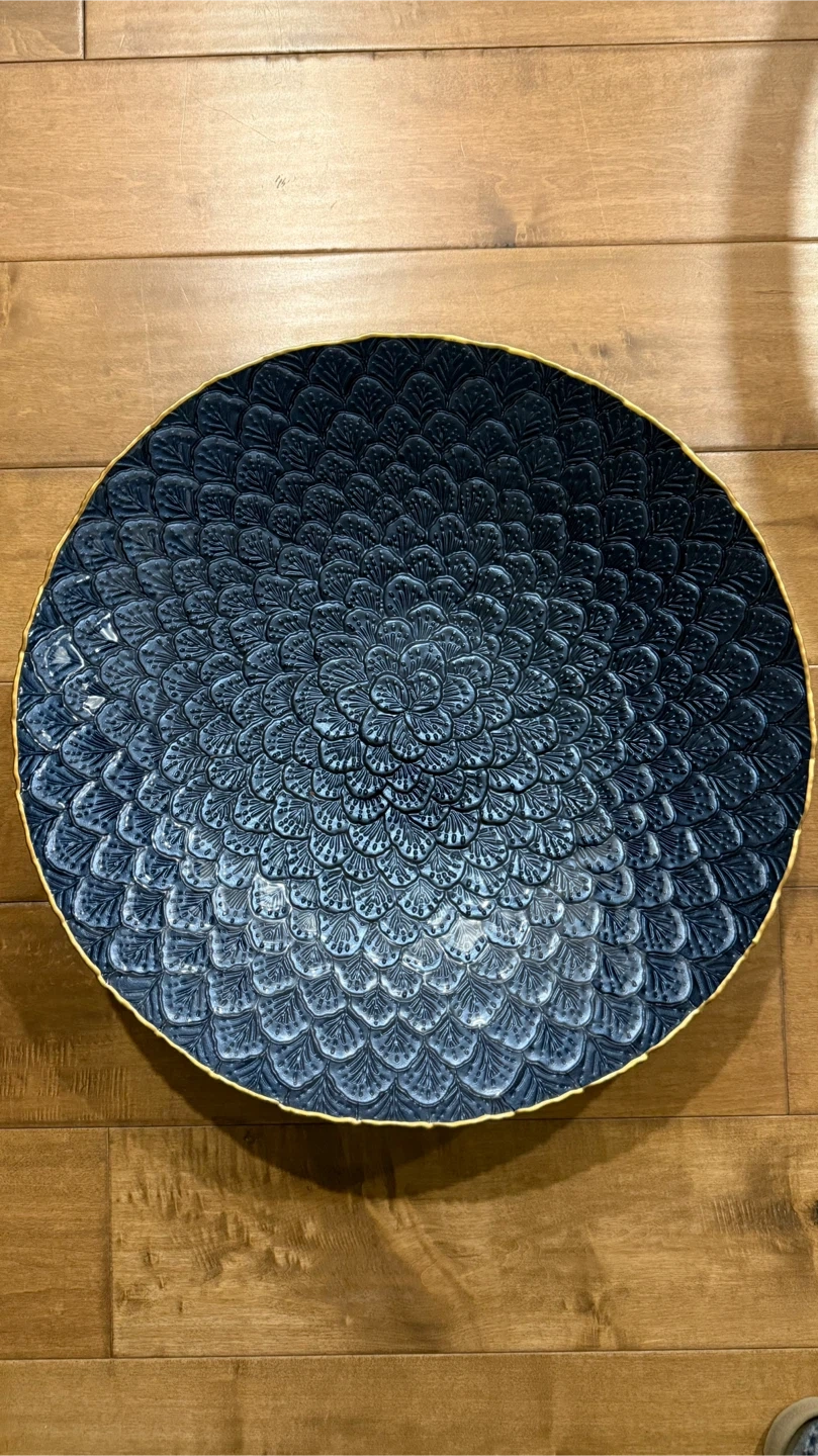 It’s a lovely blue, with textured patterns all over and a gold trim.