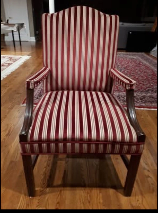 This is a used red striped antique chair, perfect as an accent piece. The chair is in good condition. Here are some details about the chair: