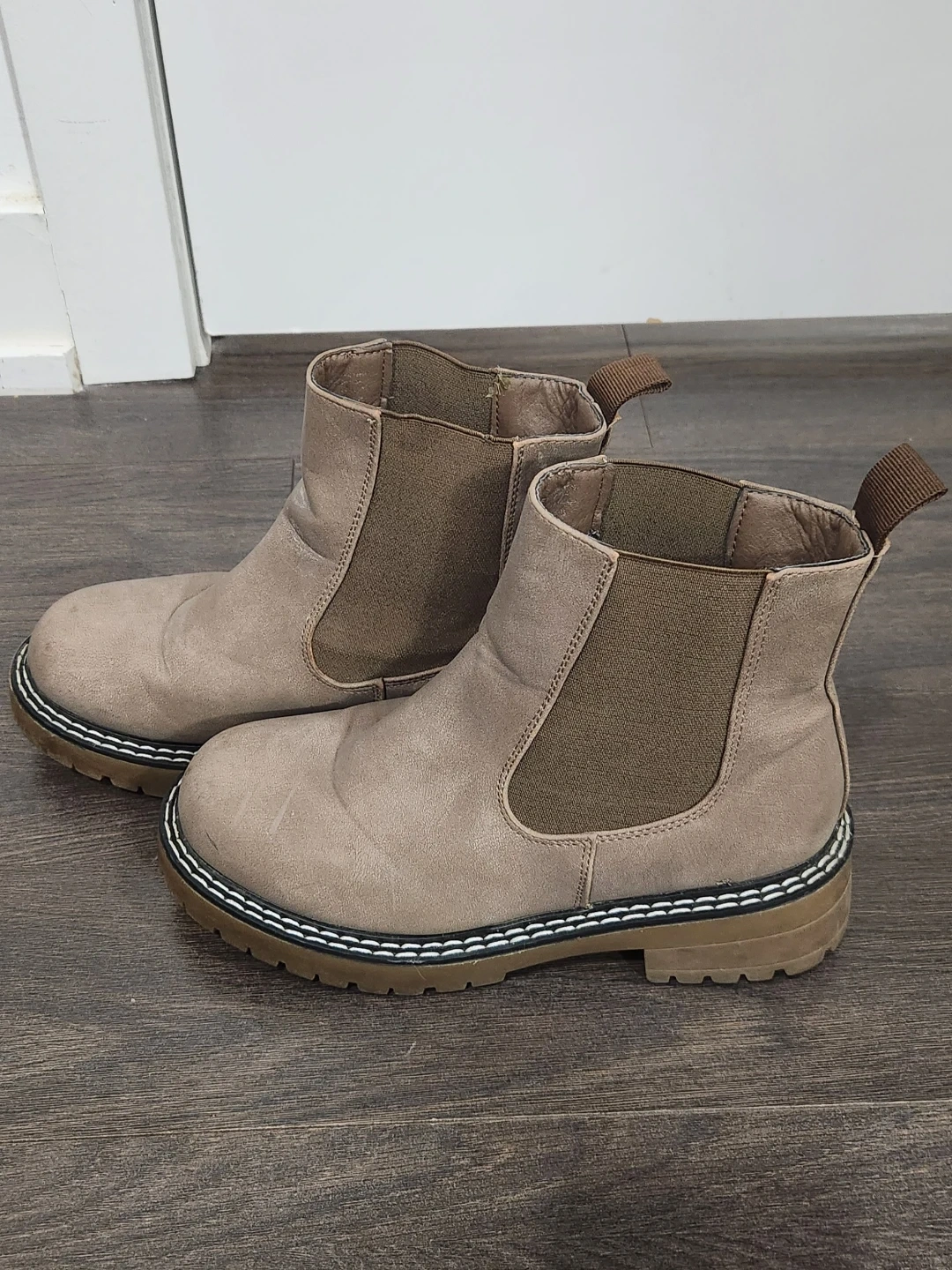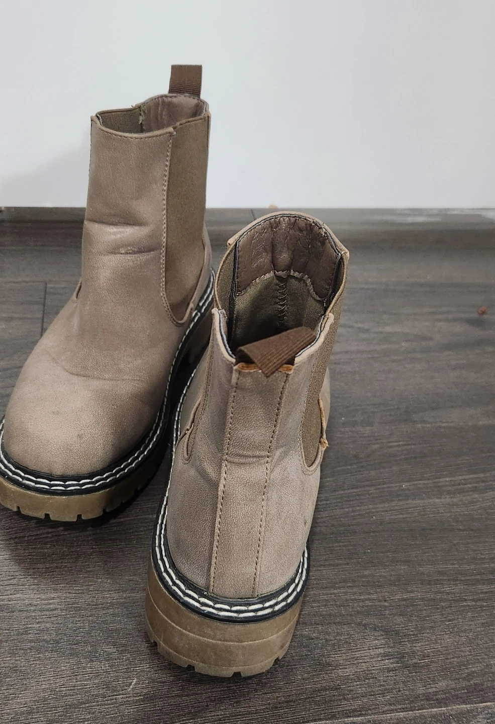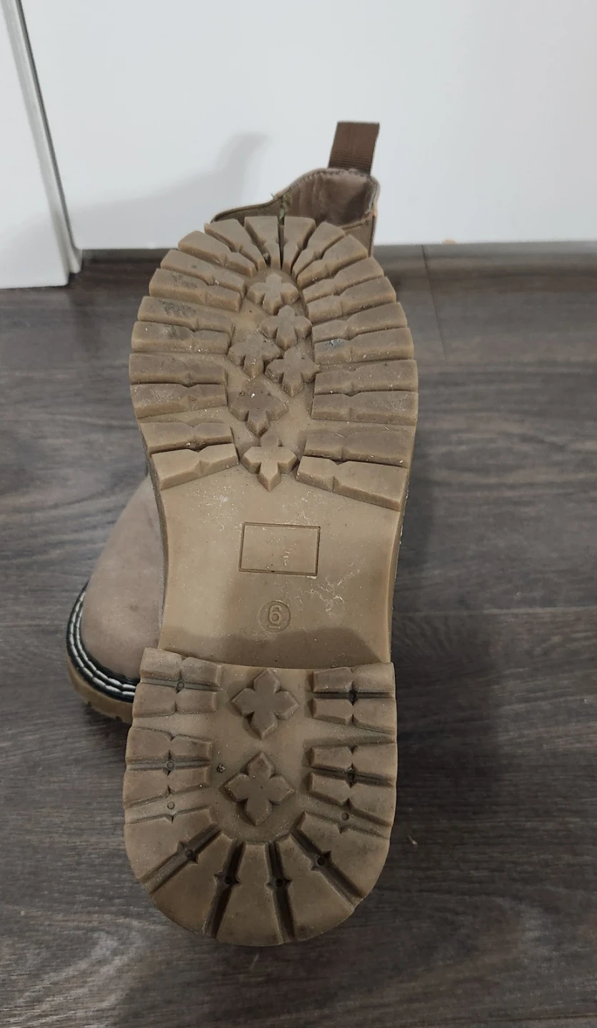 Selling a pair of Chelsea boots in size 6. They have a neutral, earthy tone and are in good condition. Perfect for everyday wear!