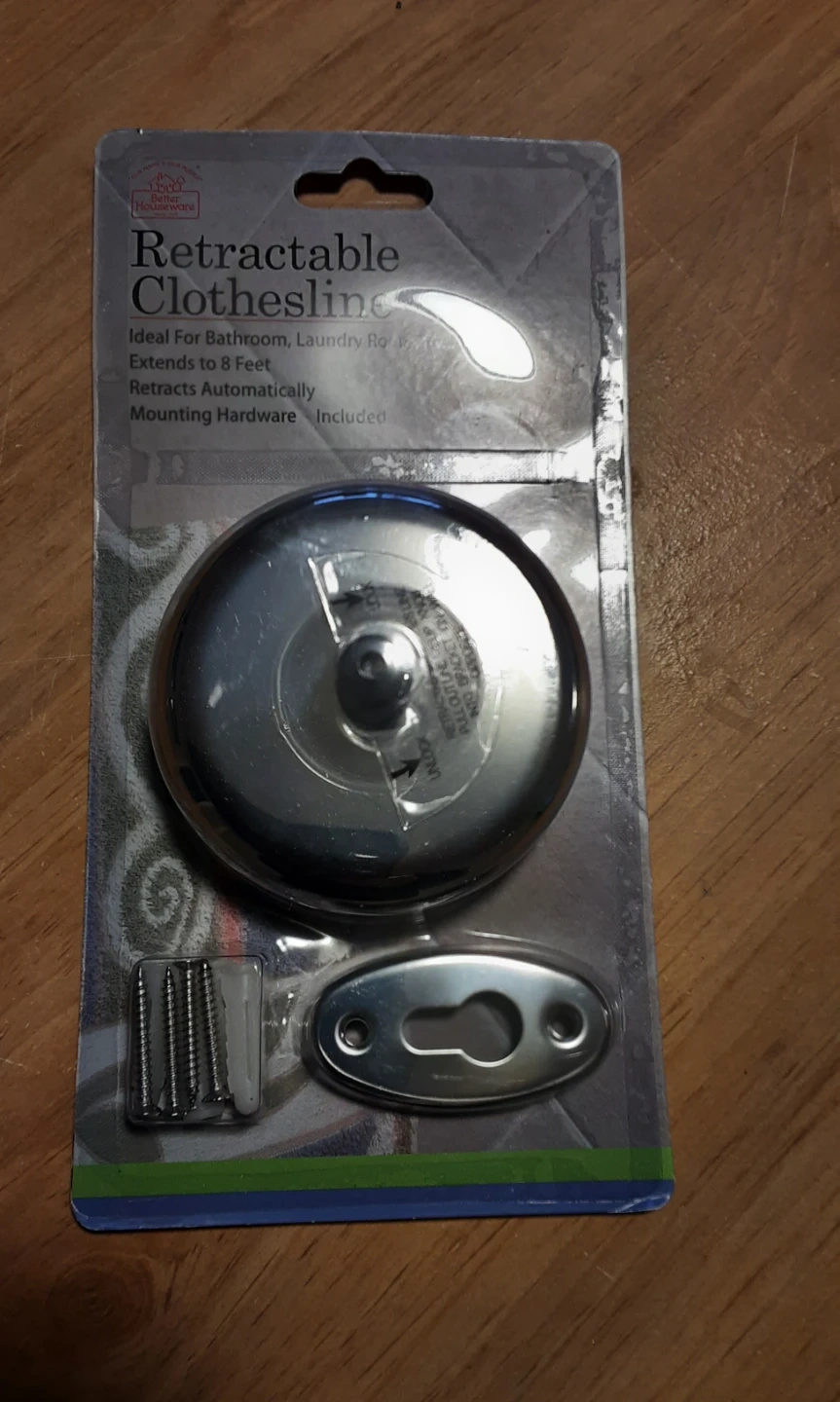 Selling a brand new, in-package retractable clothesline from Better Houseware! It's ideal for bathrooms or laundry rooms. It extends up to 8 feet and retracts automatically. Mounting hardware is included