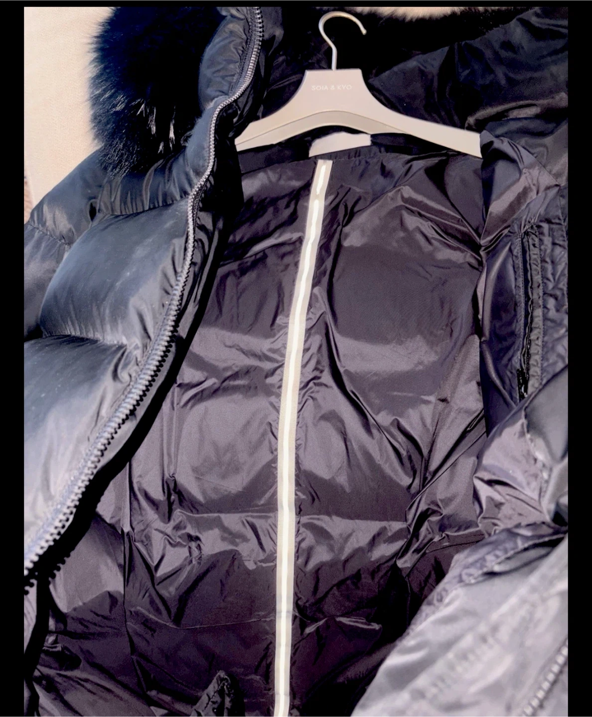 Cozy black down coat from Soia & Kyo. It's in great condition and ready for winter weather!new real fur