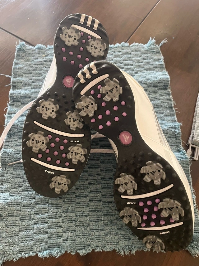 Like NEW!! Adidas women's size 6.5 golf shoes, perfect for hitting the links in style and comfort! These shoes feature FitFOAM technology for superior cushioning and TRAXION outsoles for excellent grip. They are ready for many more rounds of golf.