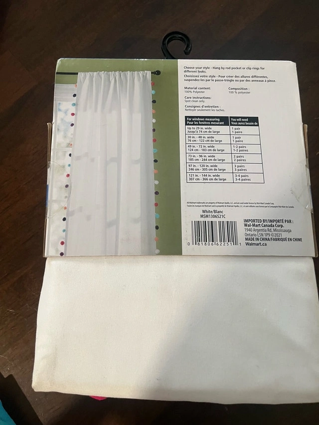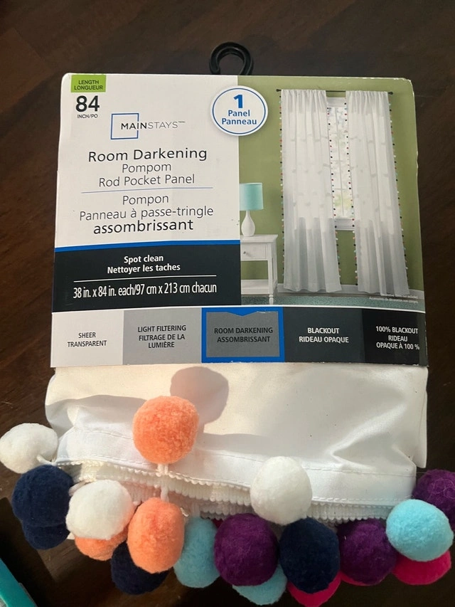 Add a touch of whimsy to any room with this Mainstays room darkening curtain panel, featuring adorable pompom detailing and rod pocket design, sized at 38 inches by 84 inches. This item is new in packaging. Specifications include: