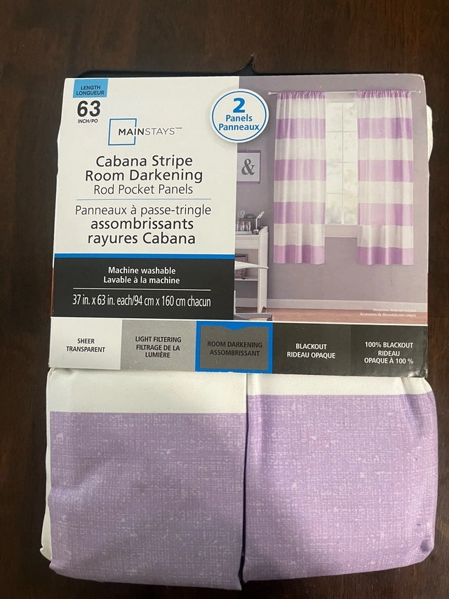 I'm selling a set of Mainstays Cabana Stripe Room Darkening Rod Pocket Panels, each measuring 37 inches by 63 inches, for a total of two panels. These curtains are designed to darken a room while adding a touch of style with their cabana stripe pattern. These are used in good condition.