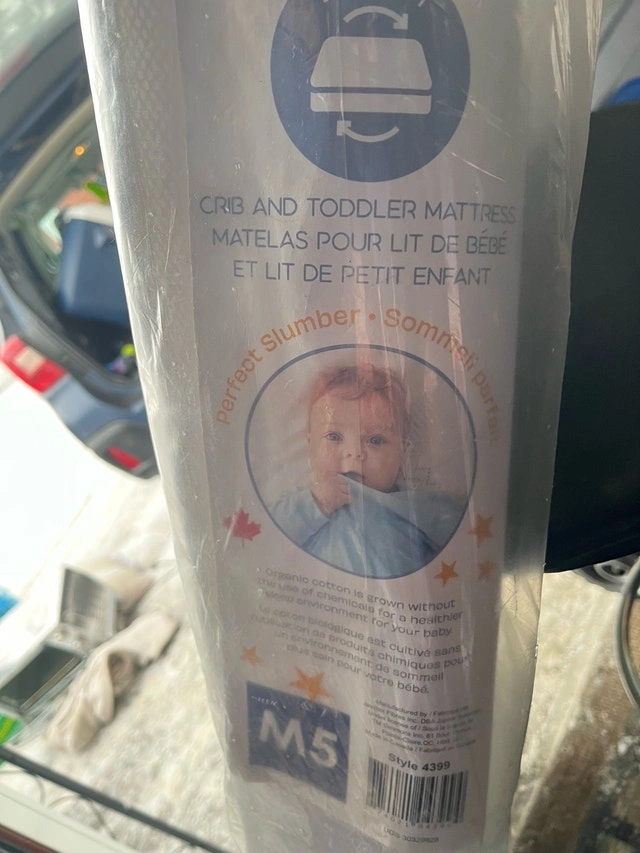 I'm selling a new Simmons baby crib and toddler mattress, still in its original packaging. It's a 2-in-1 design, certified safe, and made with organic cotton. Perfect for a good night's sleep for your little one!