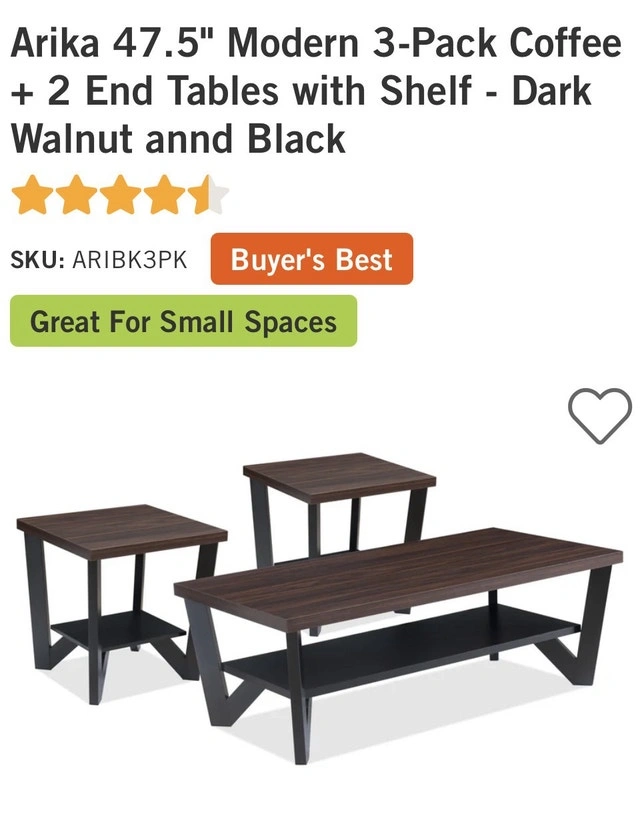 This Arika 47.5" modern 3-pack coffee + 2 end tables with shelf, in dark walnut and black, is great for small spaces and will add a touch of class to any room. This set is new in its original packaging, with the box a bit beat up from storage. If the ad is live, the item is available! PU 142st & 107 Avenue. Please check out my other ads