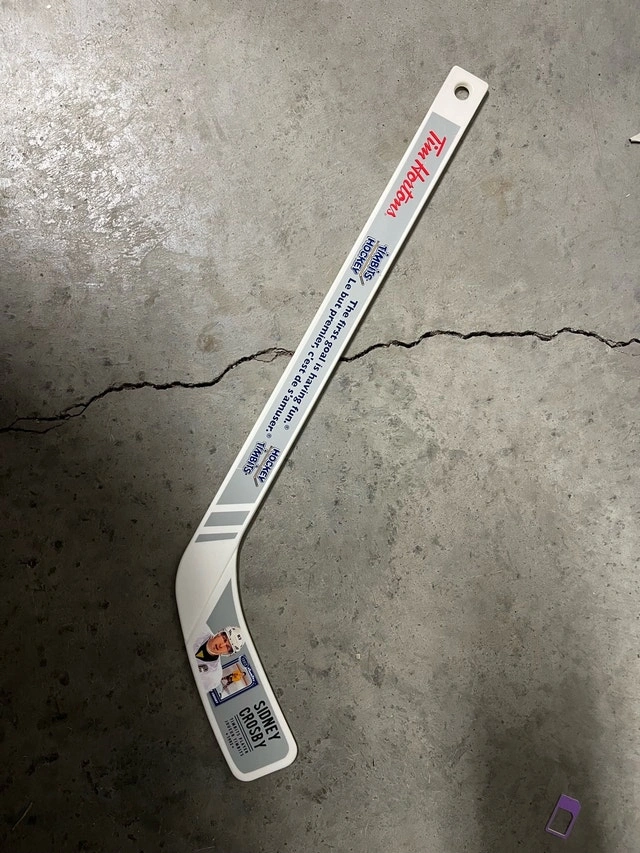 This is a Sidney Crosby Tim Horton's hockey stick, great for young fans or collectors, featuring Sidney Crosby and the Timbit's Hockey program's motto. This stick is perfect for a bit of fun off the ice! It's gently used, showing some minor wear, but is ready for its next adventure. If the ad is up, the stick is available. Please check out my other ads.