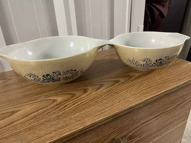 This is a charming used Pyrex Cinderella mixing bowl set in the "Homestead" pattern, perfect for adding a touch of vintage elegance to your kitchen. The set includes two bowls, ideal for all your mixing and serving needs. Due to their age, they do show signs of use. * Includes two bowls * Featuring the "Homestead" pattern * Vintage item If the ad is still up, these bowls are still available!