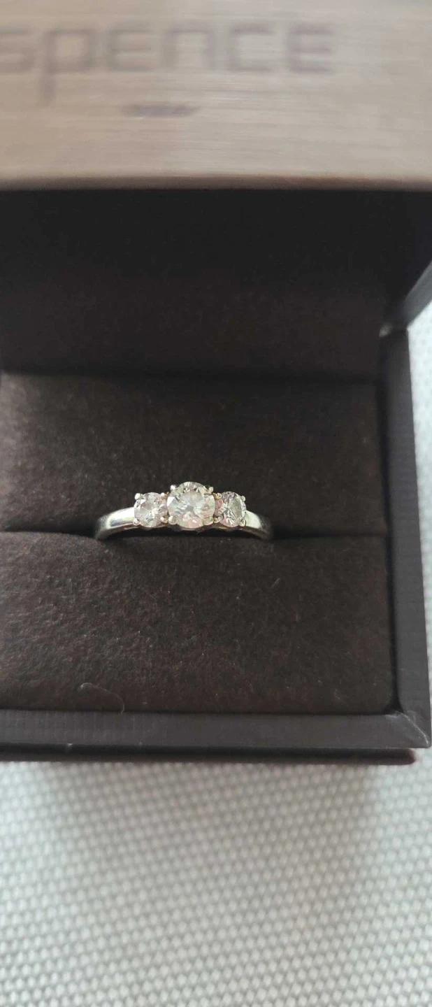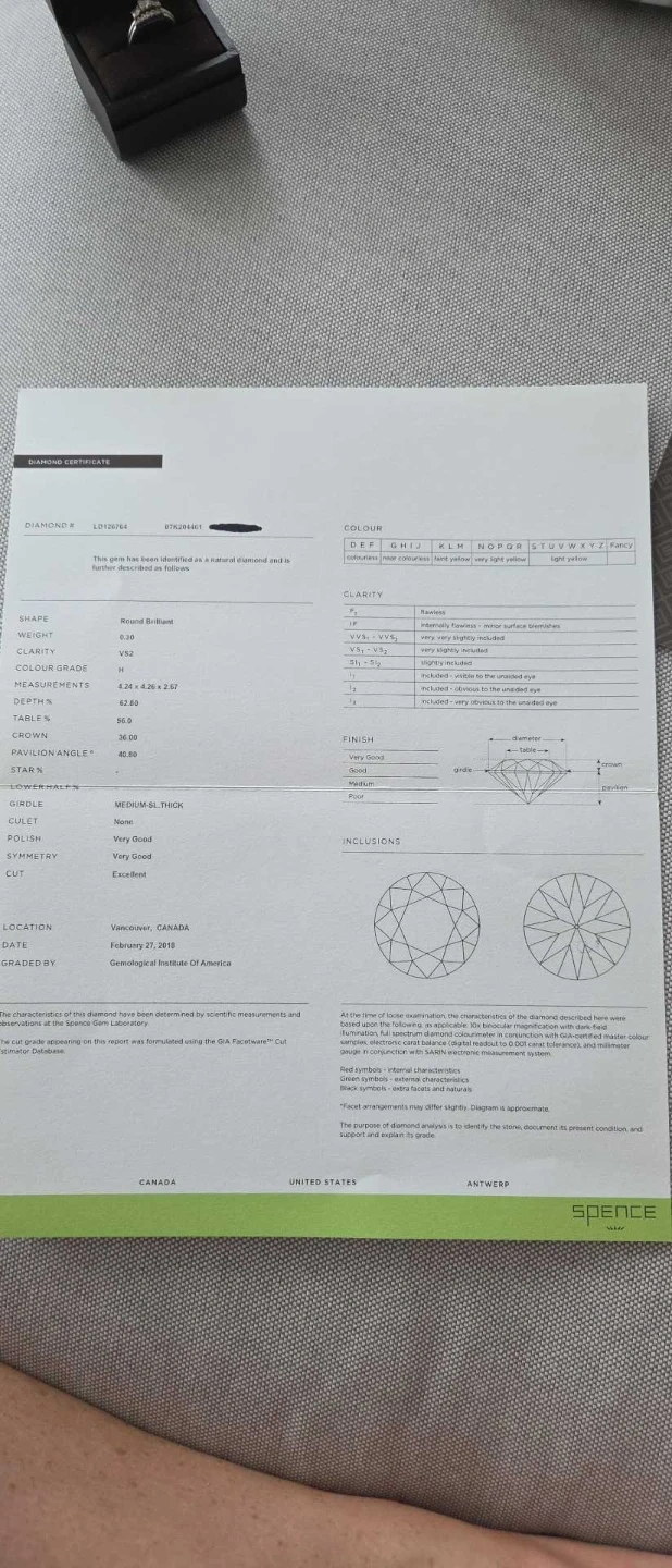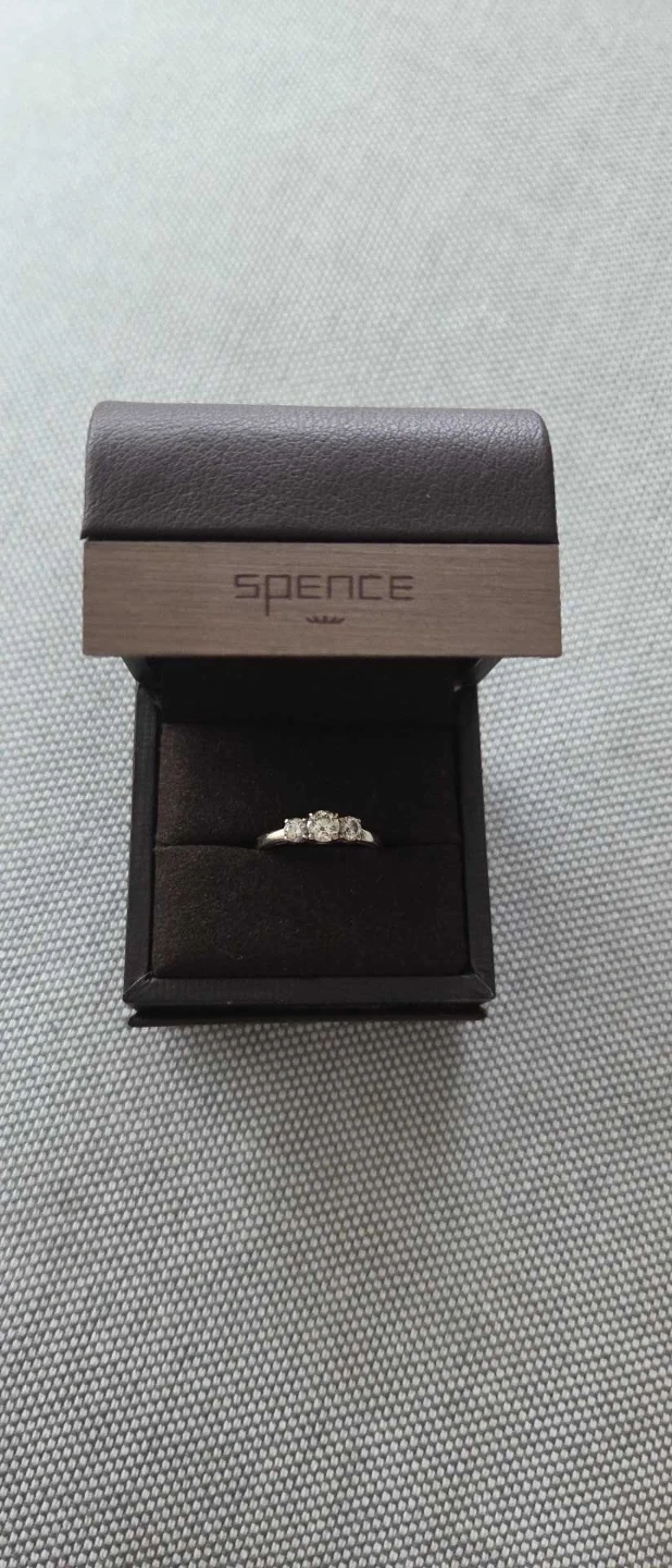 Selling a beautiful Spence diamond ring set in 19kt white gold. It features one 0.38ct round brilliant H VS-2 diamond, and two 0.249kt full cut round diamonds with GH color and VS1-2 clarity. The estimated replacement value is $2,837. Comes with the original box