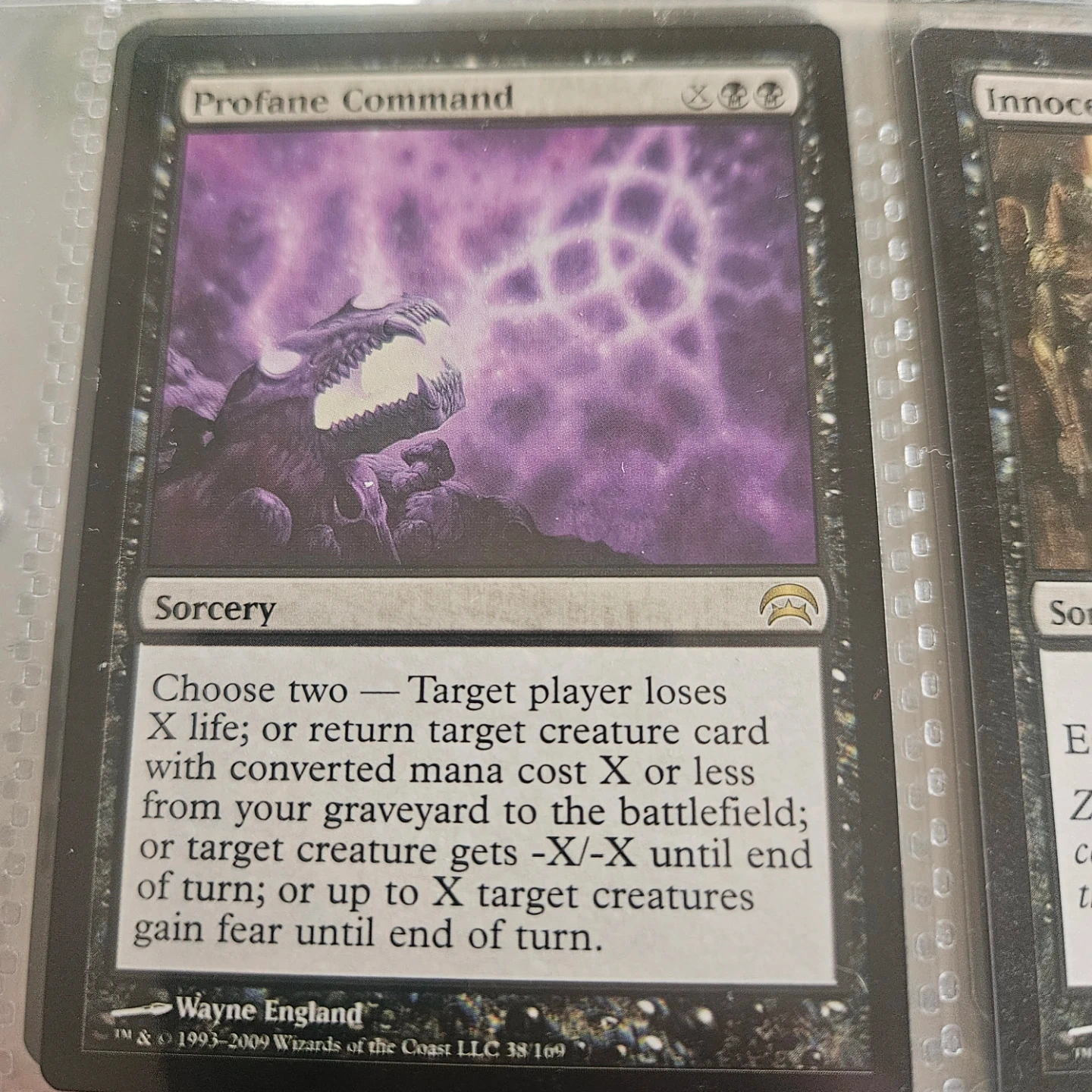 Selling a Profane Command Magic The Gathering card. It allows you to choose two options, such as making a target player lose X life or returning a target creature card. This card was made by Wizards of the Coast, copyright 1993-2009.