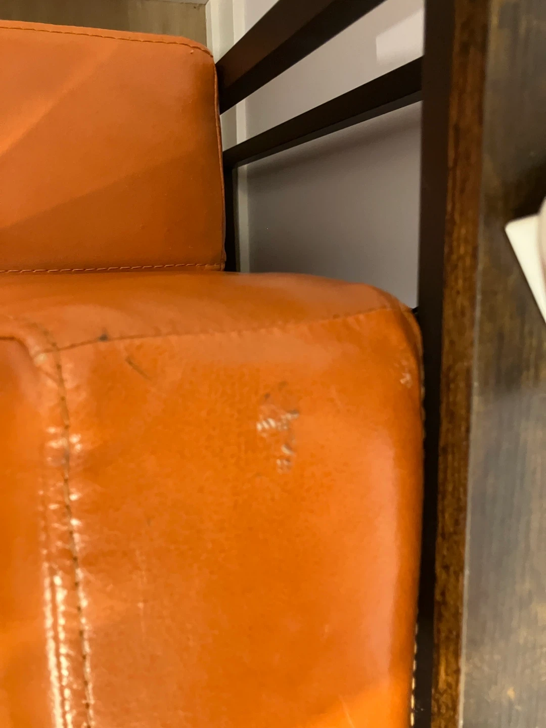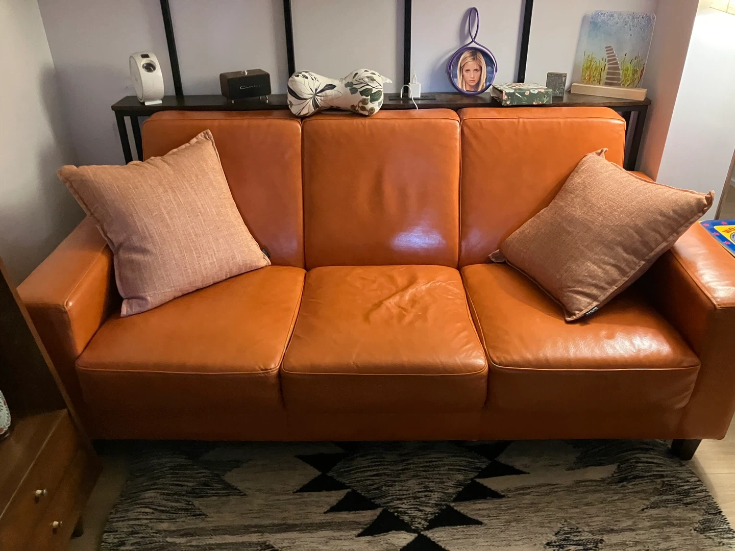 Selling a comfy orange leather sofa. There are some signs of wear and tear, as shown in the photos, but it's still got plenty of life left. It would be a great addition to any living room or den