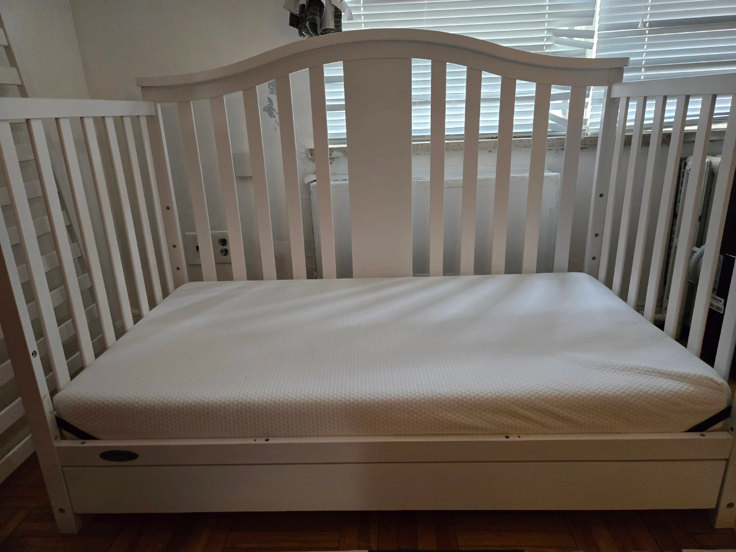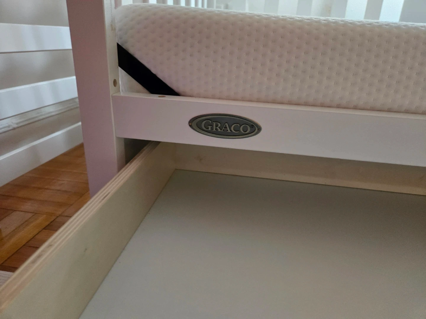 Selling a Graco Solano 4-in-1 convertible crib in white! It's in great condition and ready for a new home. The crib features a convenient drawer underneath for extra storage.