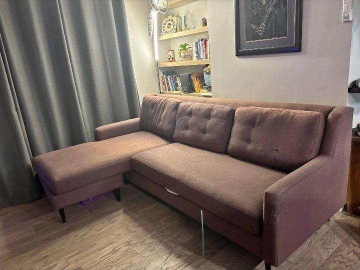 Selling a comfy brown sectional sofa! It features a chaise lounge, perfect for relaxing. The sofa has button-tufted cushions and a modern design. It's in great condition and ready for a new home