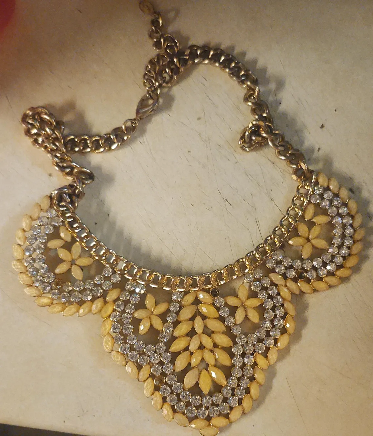 Check out this beautiful gold-tone statement necklace! It features a chunky chain and large pendants with a floral design and sparkling rhinestones. Perfect for adding a touch of glam to any outfit