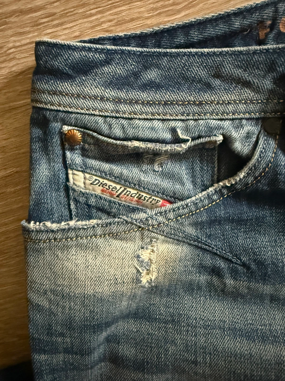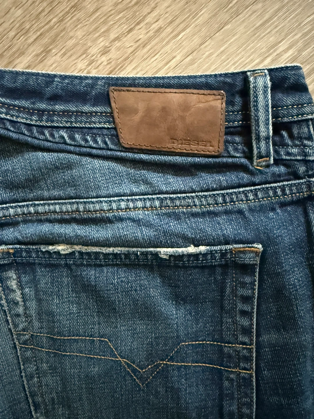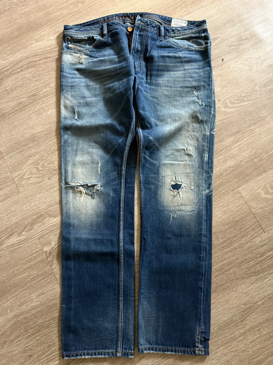 Diesel Shioner slim-skinny jeans in size W38 L32. These jeans have a distressed look with rips and fading throughout. Please see photos for condition details