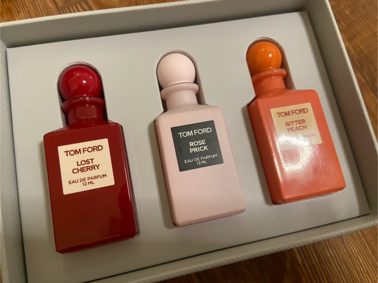 Selling a Tom Ford miniature perfume set, including Lost Cherry, Rose Prick, and Bitter Peach! Each bottle contains 12ml of eau de parfum. The set comes in its original box. Perfect for sampling these popular fragrances