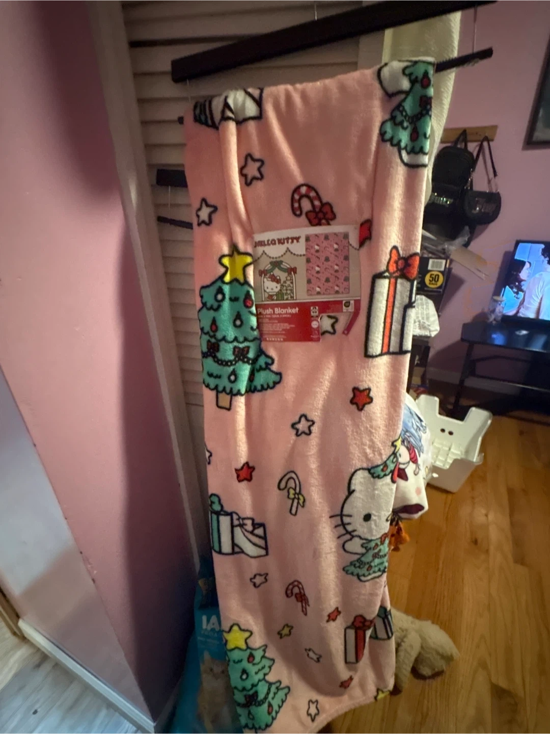 Selling a super cute Hello Kitty plush blanket with a Christmas theme! It features Hello Kitty, Christmas trees, presents, stars, and candy canes on a soft pink background