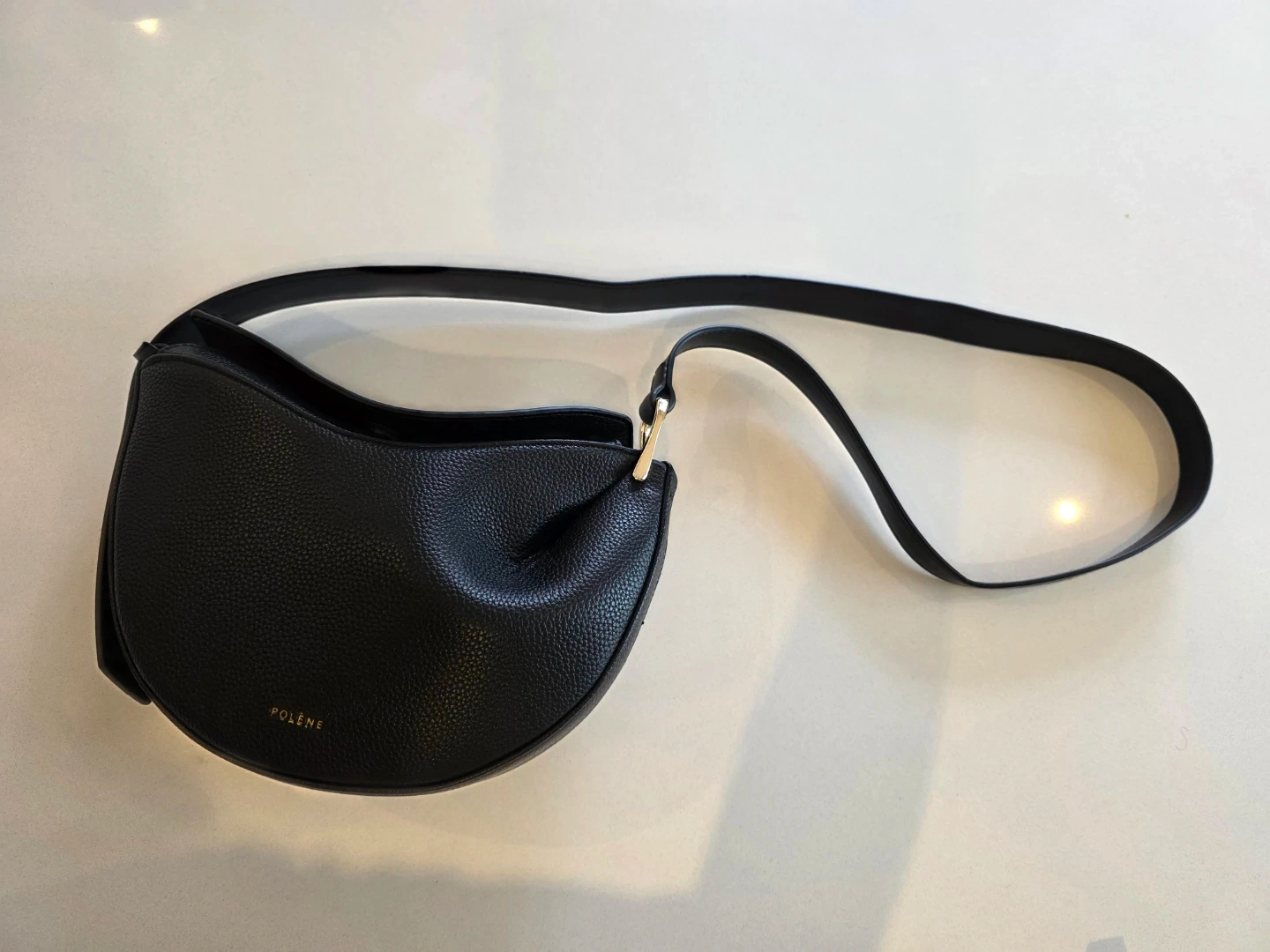 Selling a Polène Numero Dix bag in black. It's in great condition and ready for a new owner! The bag has a unique half-moon shape and is made of high-quality leather, perfect for everyday use or a night out