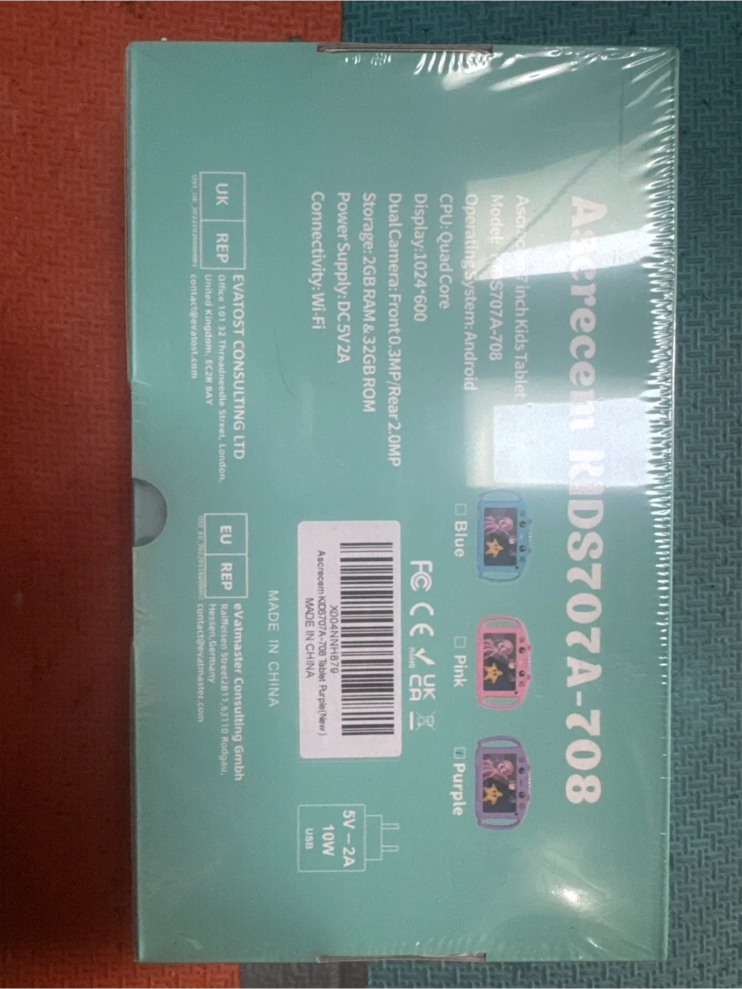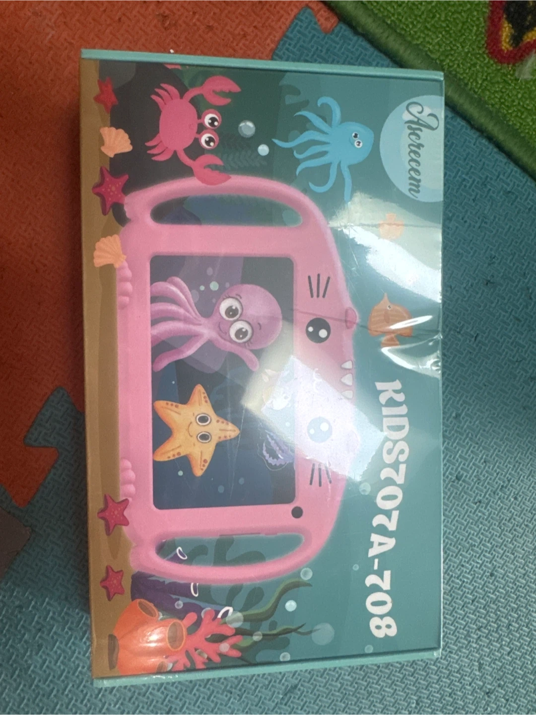 Ascrecem kids tablet! It's a 7-inch Android tablet designed for kids aged 3-14. It has a shockproof case and parental controls, perfect for educational games. The tablet has 2GB RAM and 32GB ROM. Comes with the original box!
