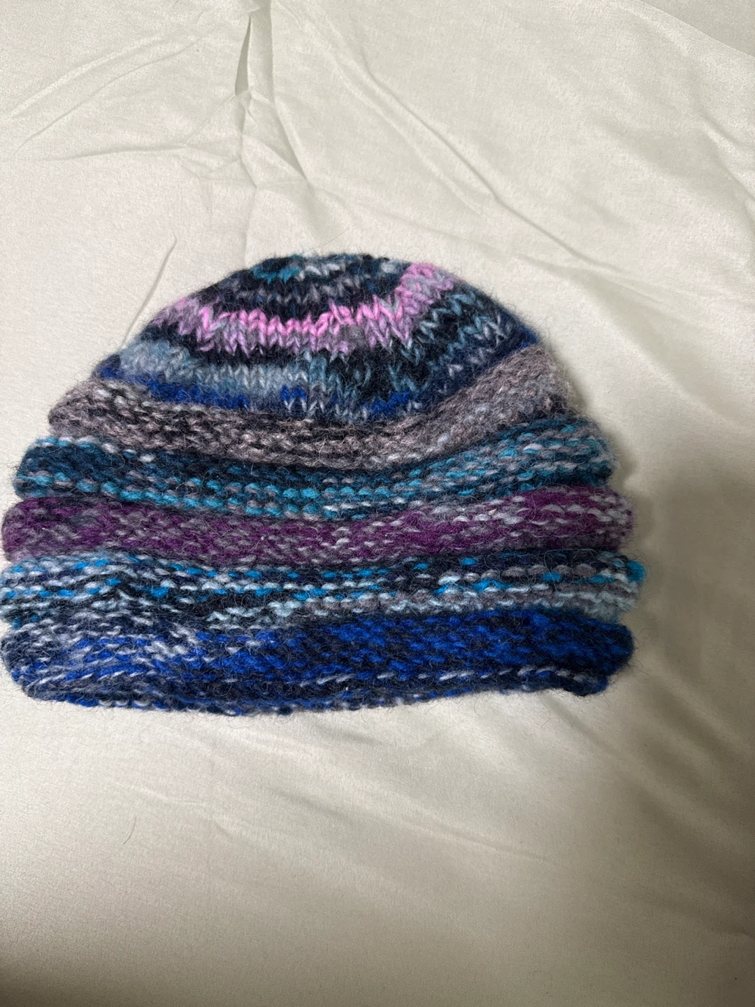 Cozy up with this handmade knit beanie! It features a lovely blend of blues, purples, and greys. Perfect for keeping warm on chilly days!