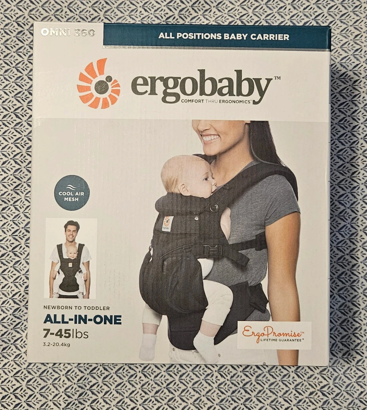 All-position carrier (newborn to toddler, 7–45 lbs) with lumbar support and Cool Air Mesh for comfort.