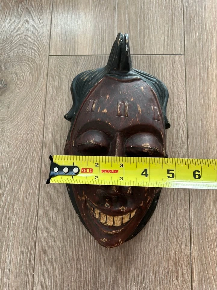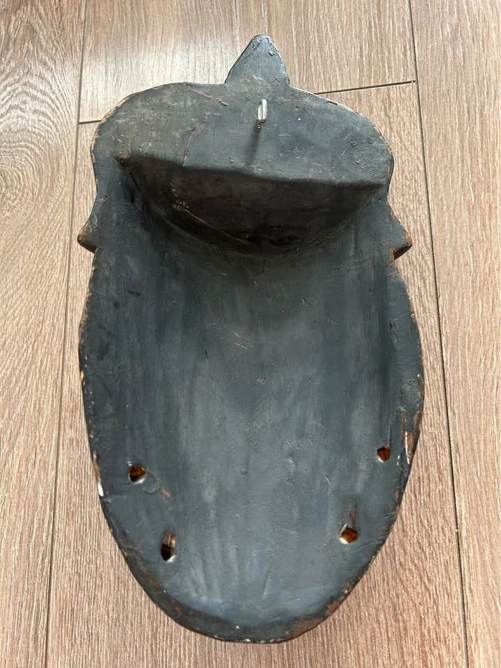 This mask was produced as decorative art rather than a ceremonial object, typical of mid-to-late 20th century export carvings inspired by traditional tribal aesthetics. The hand-carved details, expressive teeth, and weathered patina make it a striking wall accent for collectors who appreciate raw, timeworn décor.
