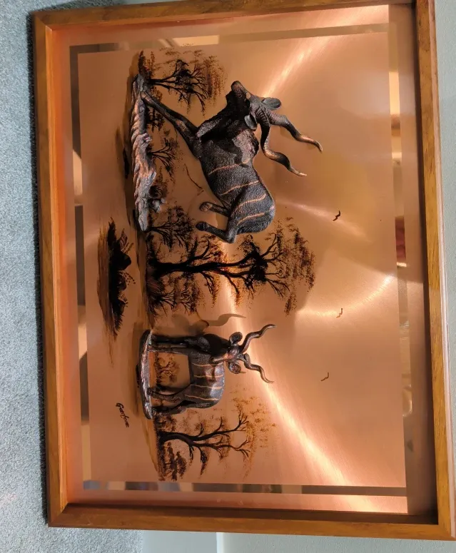 Beautiful framed copper art featuring an antelope scene. The artwork has a unique embossed design and a warm, rustic feel. It would make a great addition to any home decor!