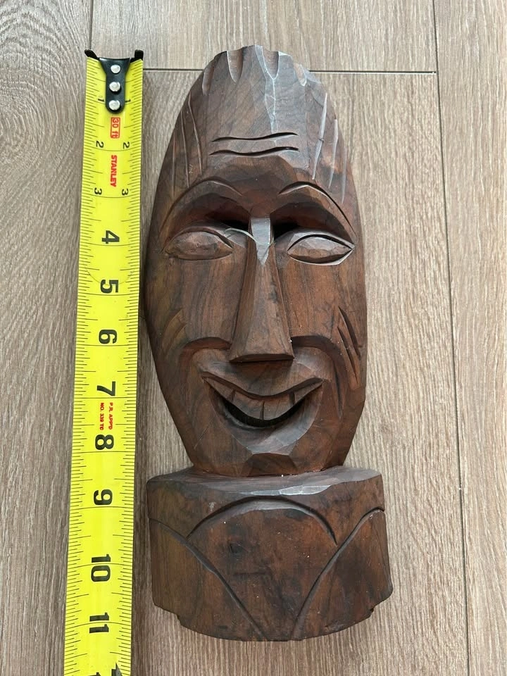 Vintage hand-carved wooden wall mask featuring a warm dark wood tone and expressive facial form. This piece shows confident carving with angular eyes, elongated nose, and subtle smile, giving it strong character and visual depth. The faceted carving style highlights the natural wood grain and adds a sculptural, folk-art feel.