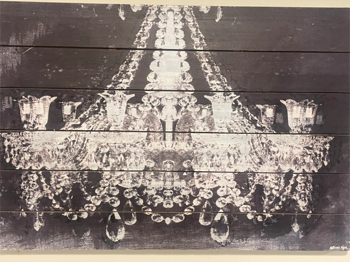 Chandelier design printed on wood planks. Adds a rustic, elegant touch to any room