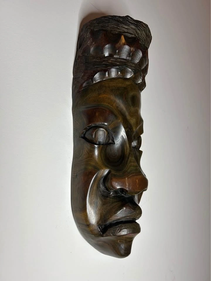 Striking hand-carved wooden wall mask in a classic African tribal style. Crafted from a solid piece of hardwood, this mask features deep sculptural carving, expressive facial proportions, and a rich dark patina developed over time.