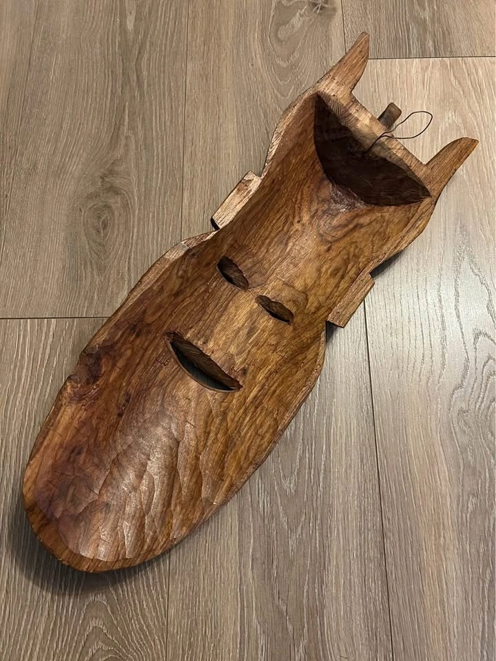 • Design: Tribal-style mask featuring an expressive face, arched brows, and a wide smile.