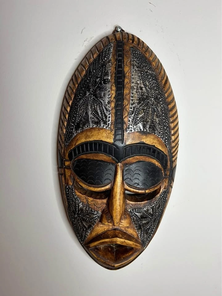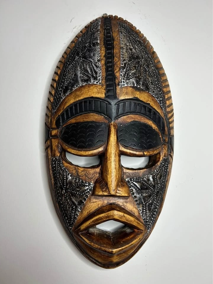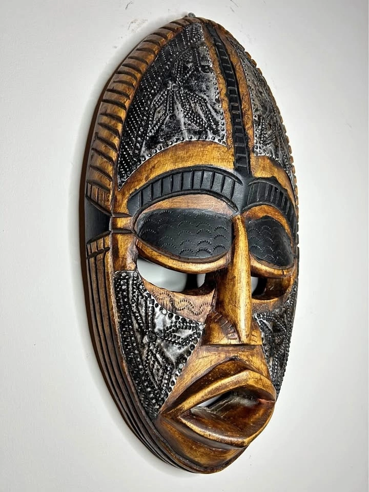 Striking vintage African wall mask crafted from solid carved wood and decorated with metal inlay and embossed details. This piece reflects classic West African design influences, commonly associated with Ivory Coast decorative traditions.