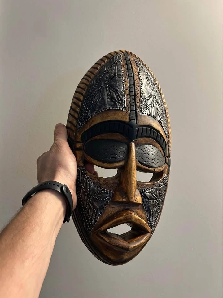 The elongated face, bold geometric features, and contrasting wood-and-metal textures give this mask a strong visual presence. Designed as wall décor rather than a ceremonial object, it was likely produced in the late 20th century for interior decoration and export.