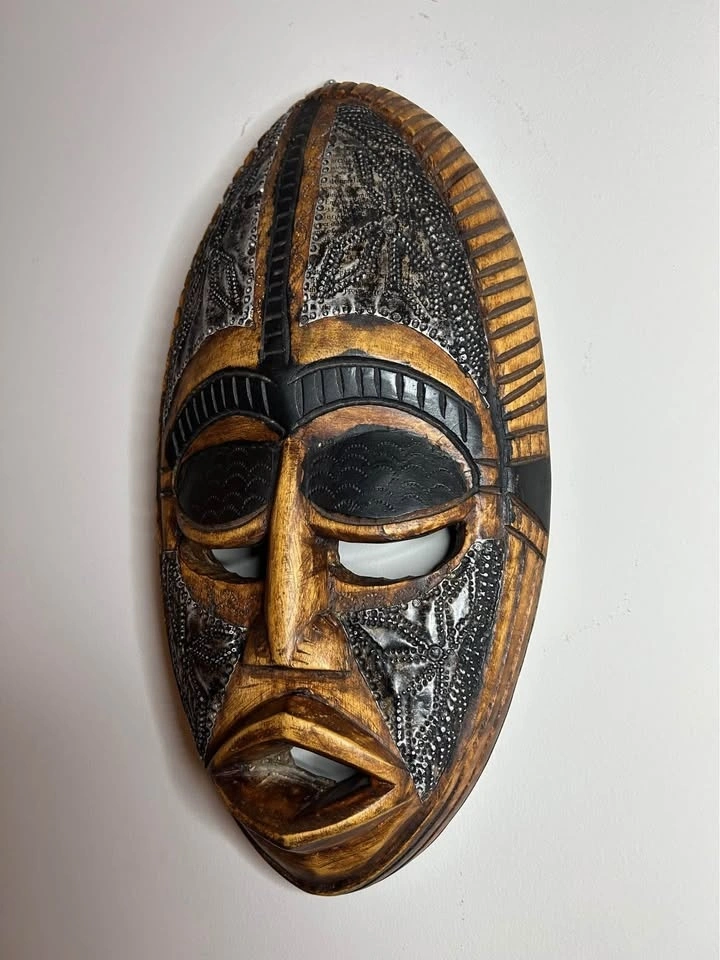 African Wooden Wall Mask with Metal Inlay