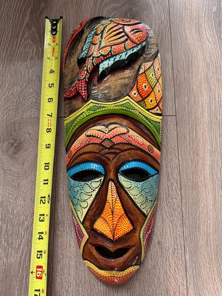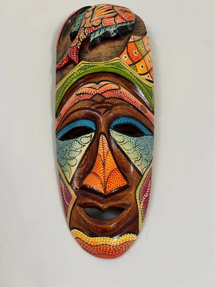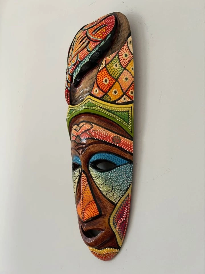 Hand-Carved Wooden Wall Mask Colorful Dot Painted 16” tall