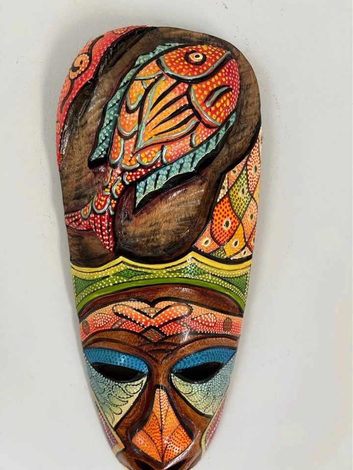 Hand-carved wooden tribal-style wall mask decorated with vibrant dot-painted patterns and layered relief carving. The design features an expressive human face with a sculptural fish motif at the top, highlighted in rich earthy browns with colorful accents in green, blue, red, yellow, and orange.