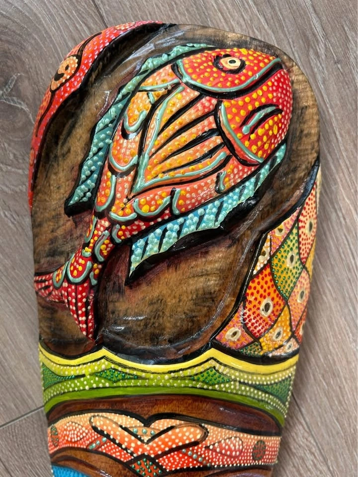 The dot painting adds texture and depth, while the visible natural wood grain enhances the handcrafted character of the piece. Strong visual presence and bold decorative appeal, ideal for tribal-inspired interiors, eclectic wall displays, or collectors of folk and ethnic decor.