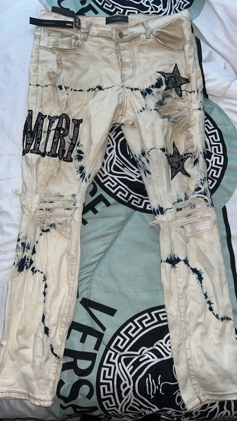 Selling a pair of Amiri jeans with a unique distressed design and star appliqués. The jeans feature a bleached wash with dark blue tie-dye details and distressed rips throughout. The Amiri logo is prominently displayed on one leg. These jeans are sure to make a statement!