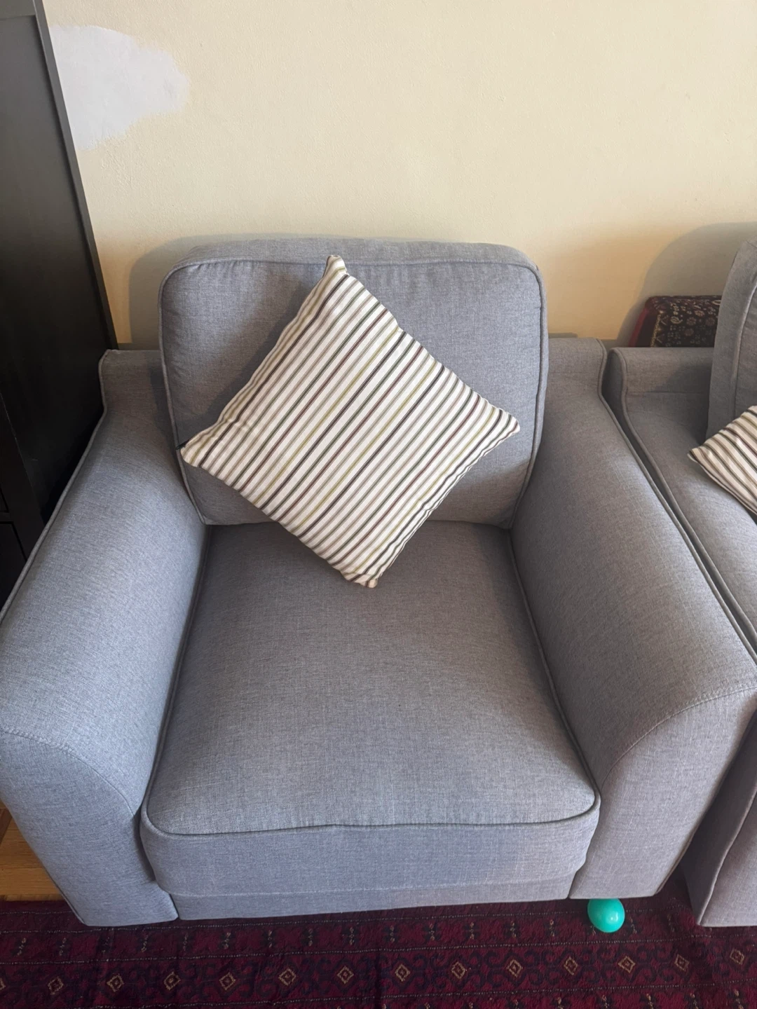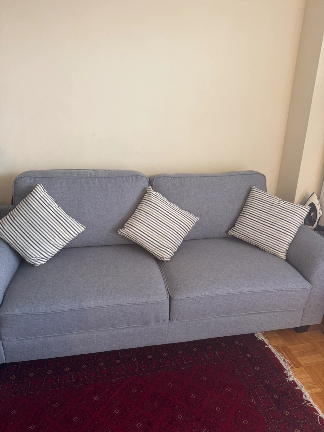 Selling a comfy grey loveseat sofa. It comes with striped cushions to complete the look. Perfect for a small space or apartment!