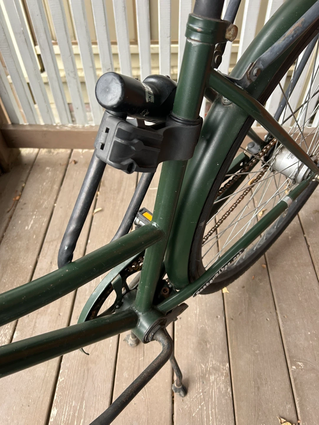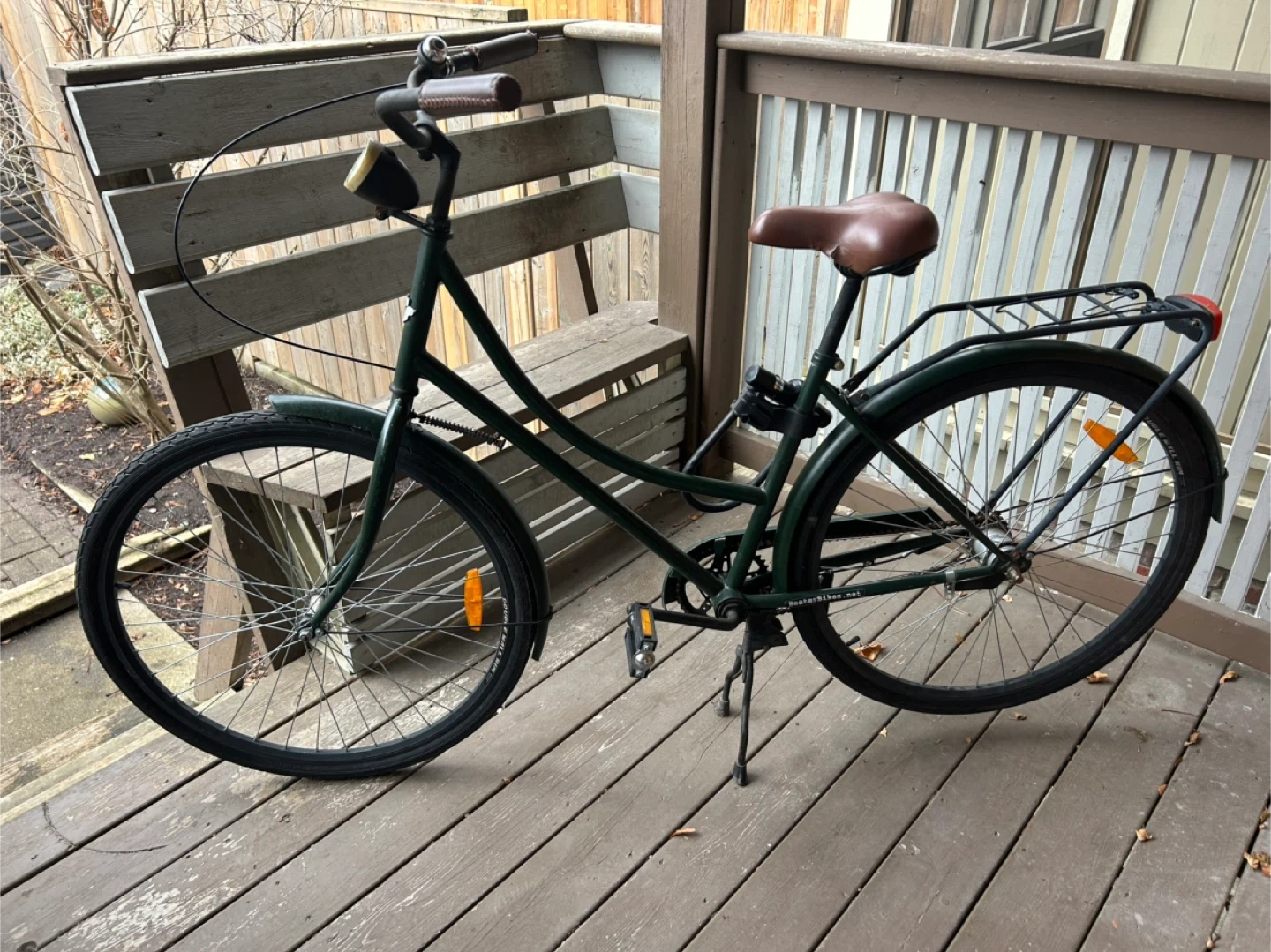 Great style, very unique. Great for cruising around Toronto. 3 speed. Breaks are back pedal. Has kick stand.